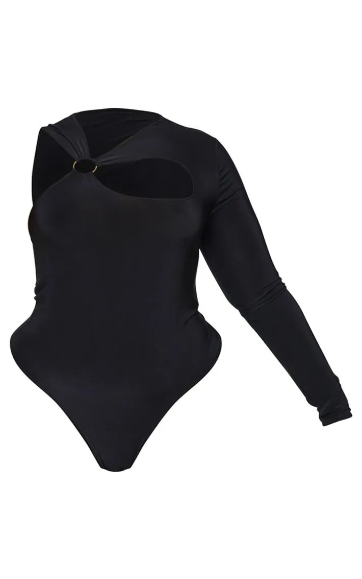 This bodysuit is sure to be a staple in your new season look. Featuring a black material with a cut out design, ring detail and one shoulder fit, we are in love. Wear with your fave jeans and strappy heels to complete the look.