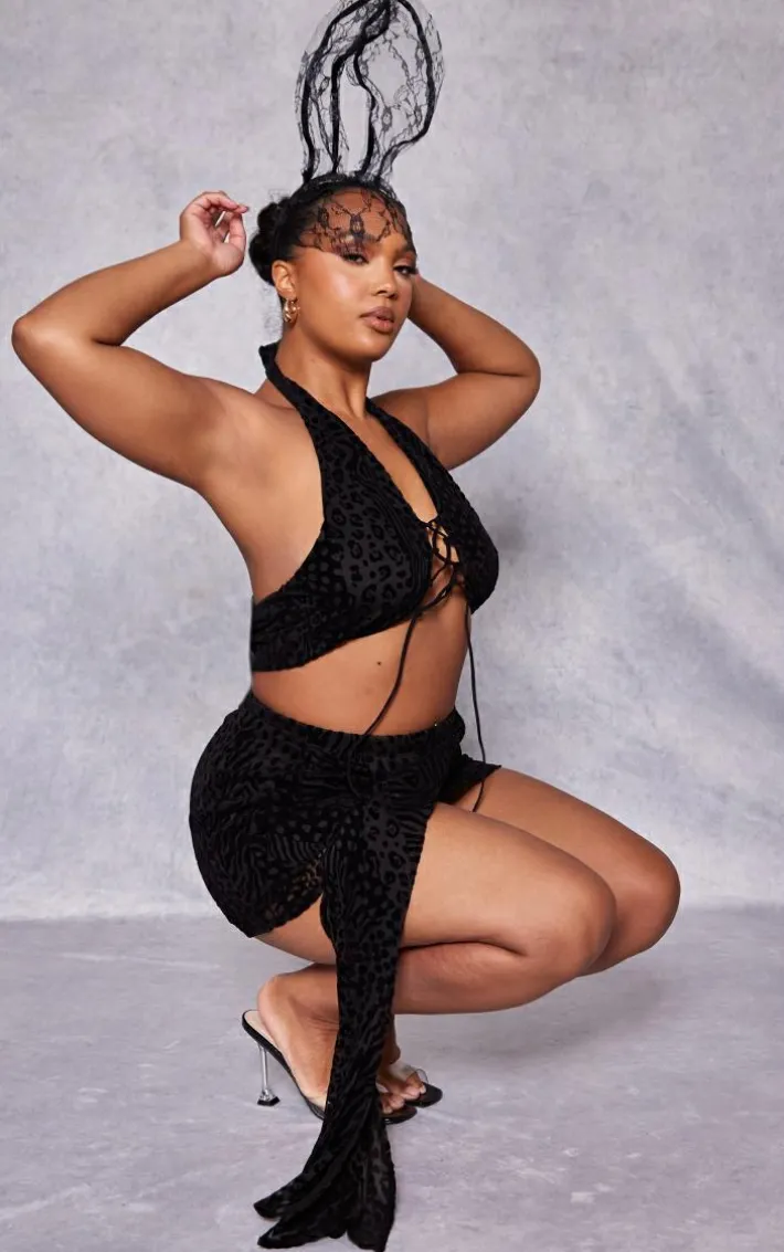 When the weekend calls for a little drama this plus black devore drape front mini skirt will have you at the center of attention. It is made using a black devore material with a drape front design and a mini length, what more could you want ? Style this plus mini skirt with the matching top, clear slip-on heels and statement accessories to elevate the look further.