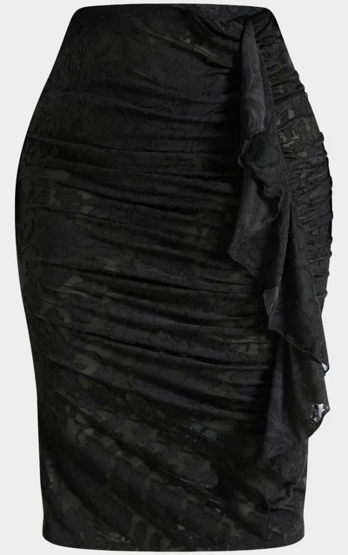 Keep it seriously chic with this plus black devore drape ruched midi skirt. Brought to you in a black devore material with a drape ruched design and a midi length that is sure to make a statement this season, this midi skirt is an essential no matter what the occasion. Team with a long sleeve top, some slip on heels and your fave bag to finish off the look.