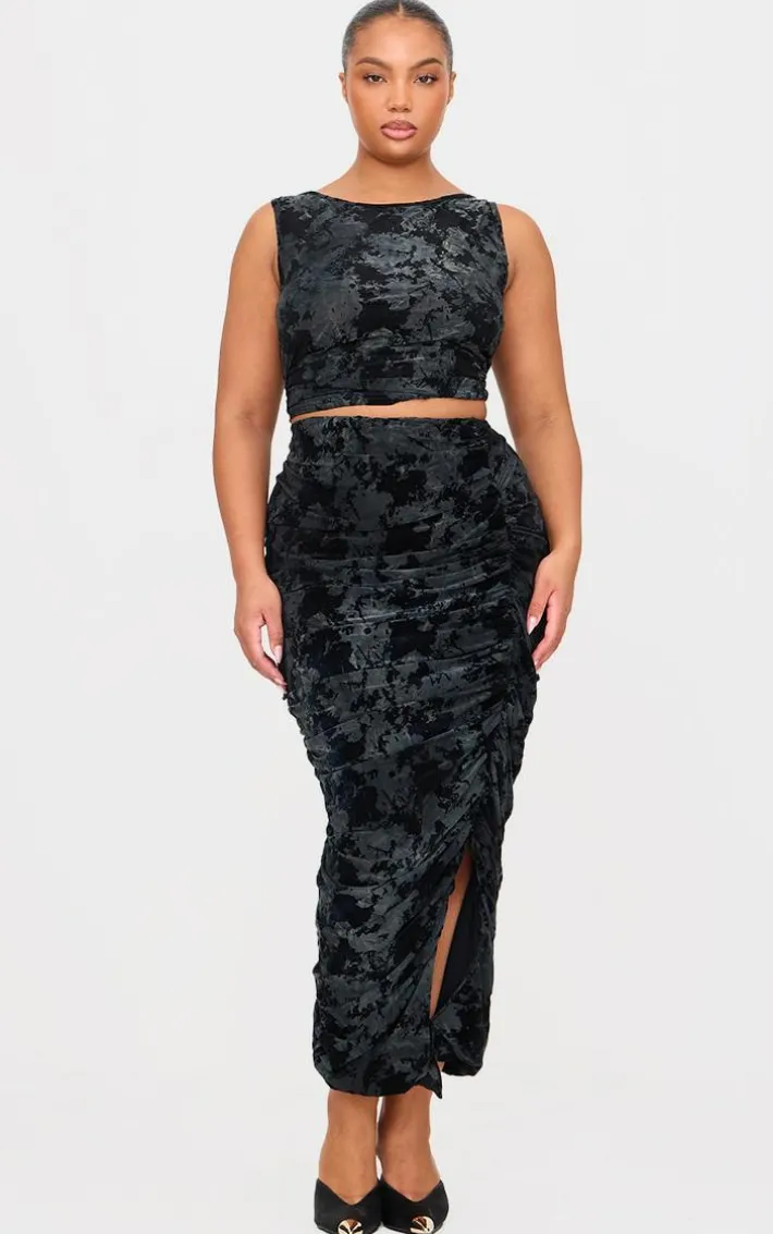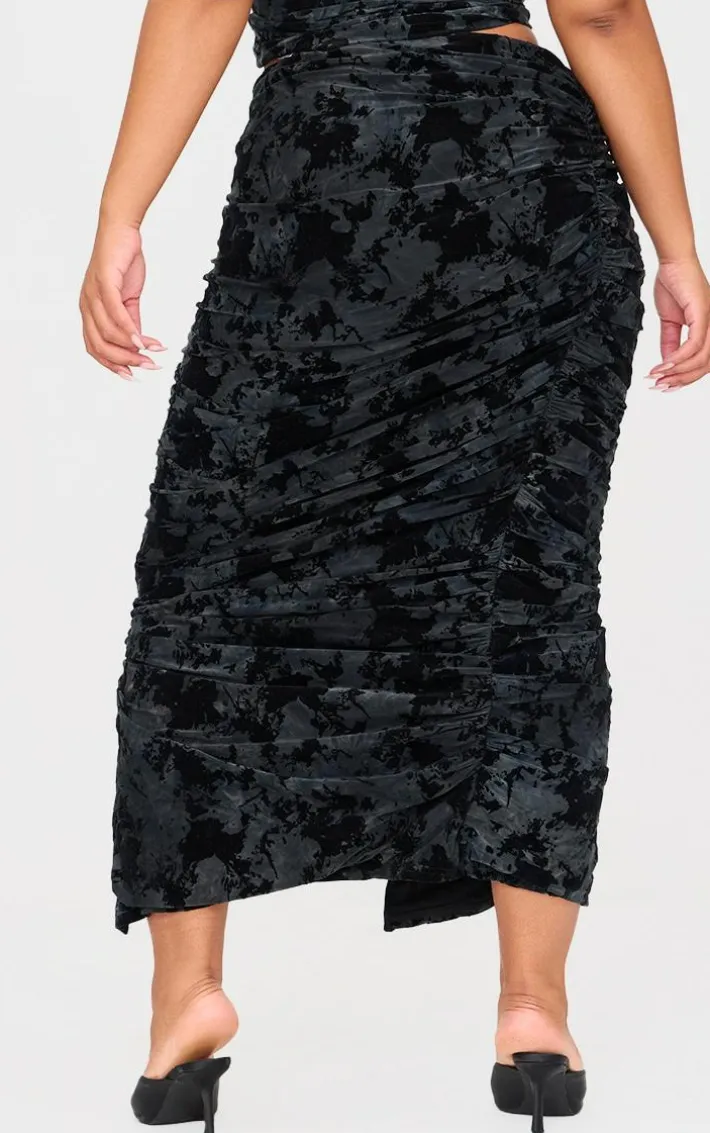 Bring all the luxe devore feels to your weekend wardrobe with this plus black devore ruched maxi skirt. Made from a black devore material with a ruched design and a flattering maxi length, how can you say no? Pair this maxi skirt with the matching top, heels and gold accessories for an effortlessly chic look worthy of your weekend plans.