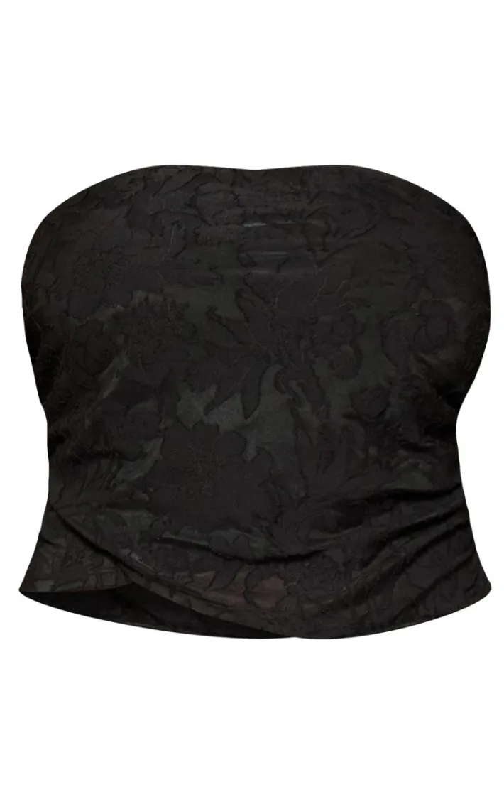 For a chic look that won’t go unnoticed, bag this plus black devore wrap bandeau top. Brought to you in a must-have black shade, with a luxe devore material, wrap detail and bandeau design, how can you resist? Pair with the matching skirt, a pair of black buckle heels and silver accessories for a complete look.