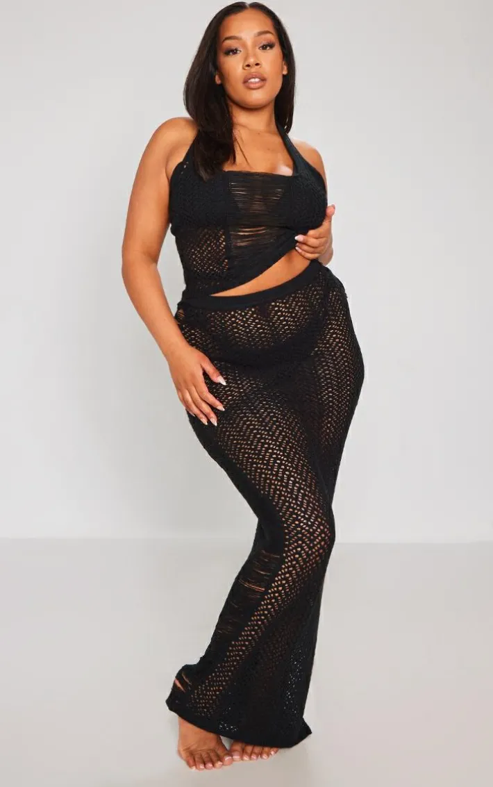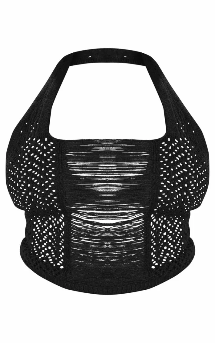 Switch up your new season style game with this plus black distressed knit halter neck crop top, we’re obsessed. This top features a black distressed knit material with a halter neck design and a cropped length, what more could you want? Style this plus top with the matching skirt, clear heels and some sunglasses for a look that will get everyone talking.