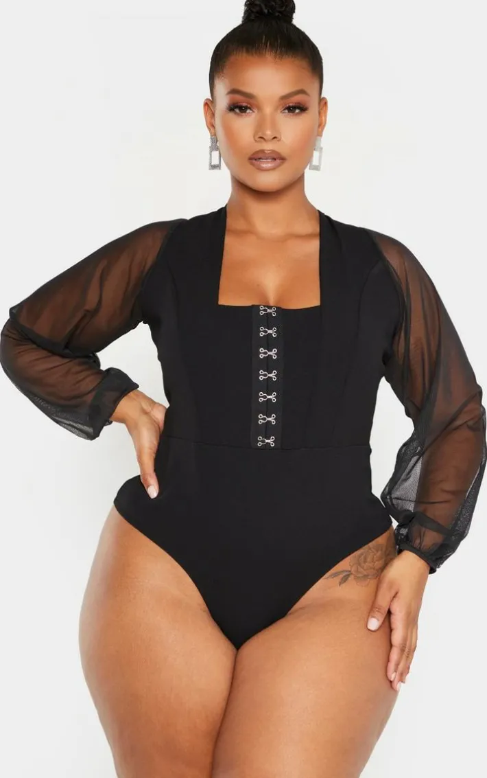 This black bodysuit is a new season go-to. Featuring a black mesh sleeved design with an eyelet detailing and a square neckline, style with shorts and mules for an all-black ensemble we’re loving.