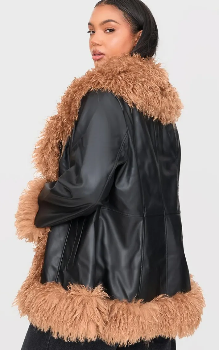 Whether you have brunch plans in your diary, or a special occasion coming up, this plus black faux mongolian fur trim faux leather jacket is perfect for you. Brought to you in a black faux mongolian material with a fur trim detail and a faux leather design, we just can’t get enough. Pair with your outfit of the day for a look that will get you noticed.