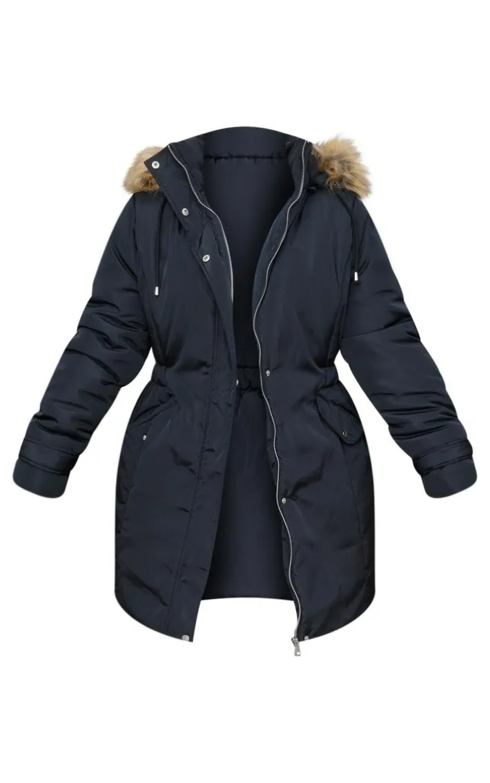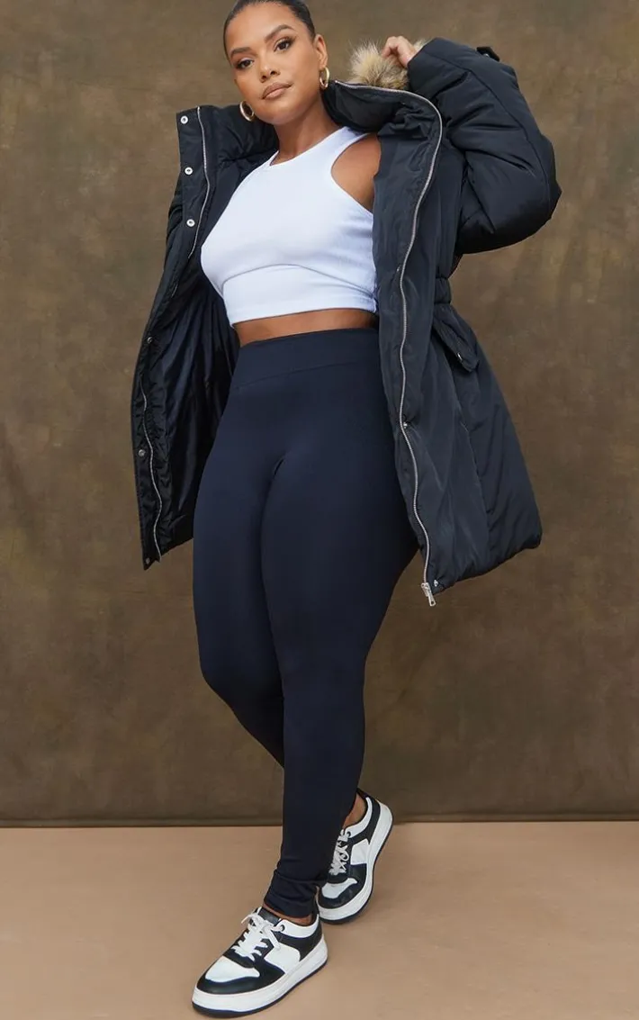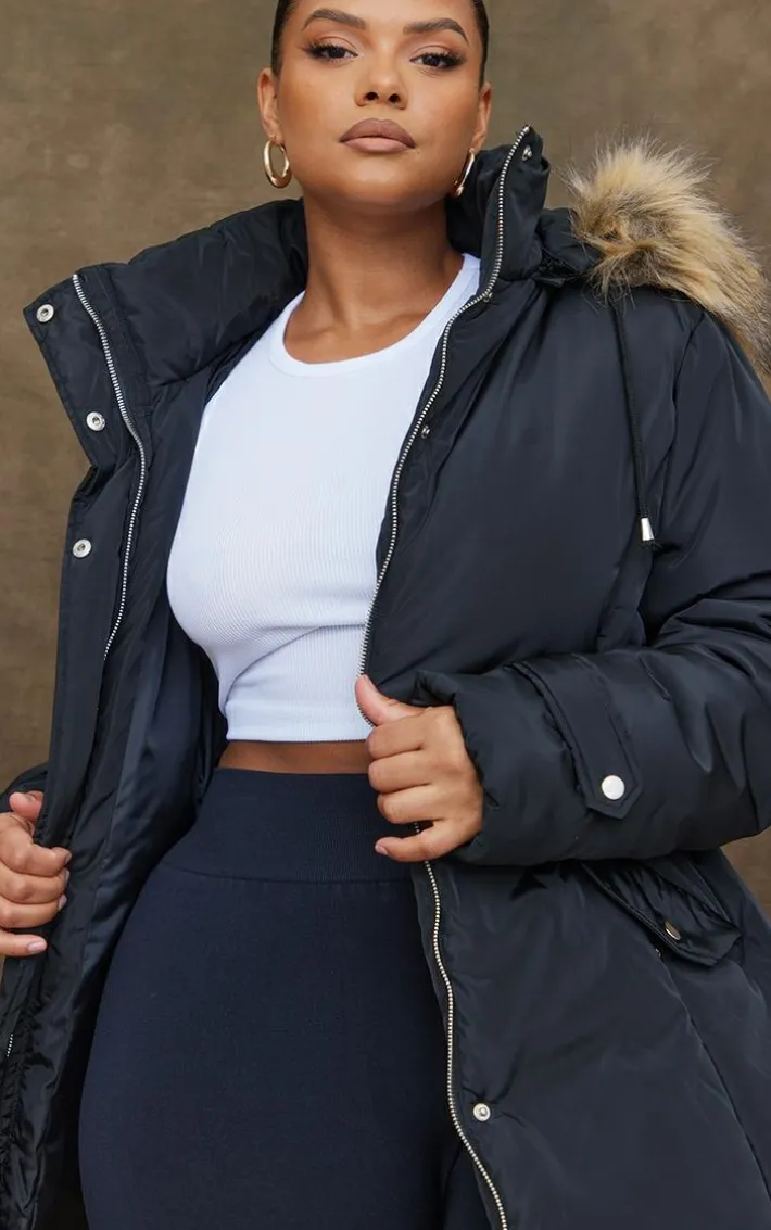 This season a padded coat is essential and we are loving this style. Featuring a black material with an elasticated waist and a fur hood, we’re obsessed. Team with your off-duty essentials to complete the look.