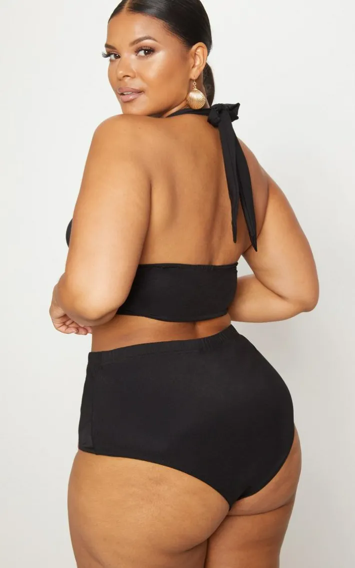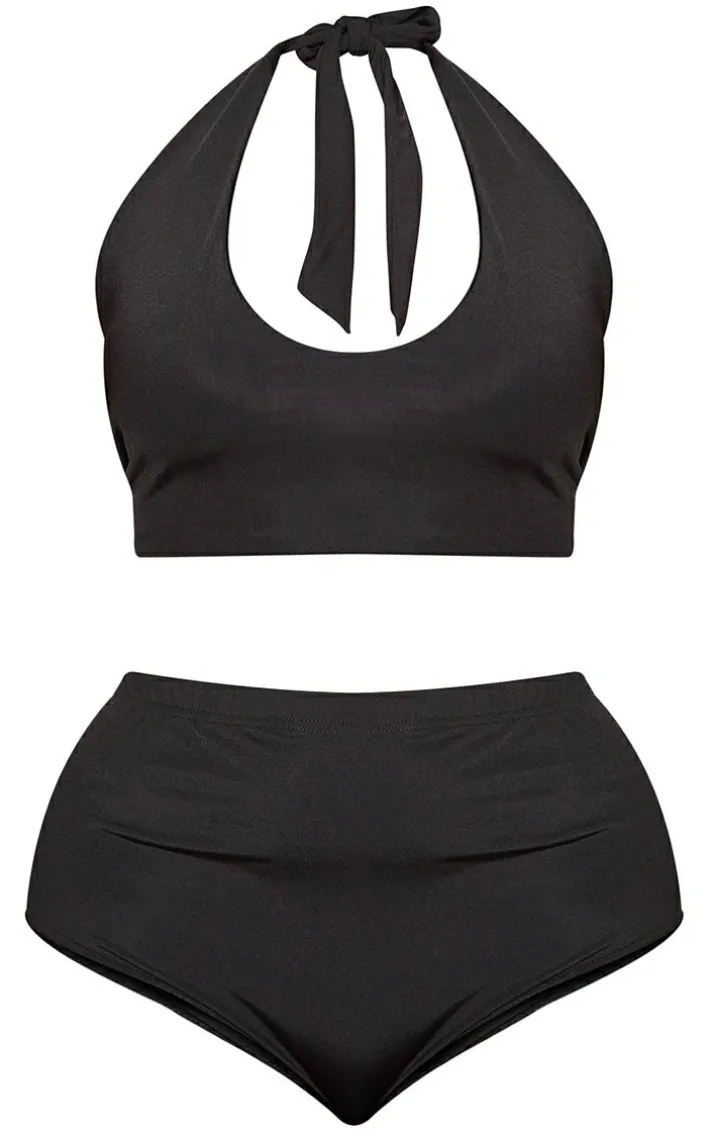 Planning a vacay away ? Then this bikini set is a must. Featuring a halterneck style bikini top with matching high waisted bikini bottoms, both in a black material. Pair this with chic sunnies and flatform sandals to complete the look.