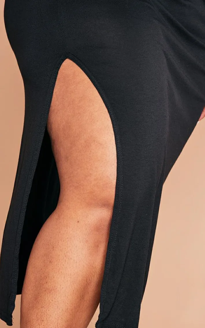 This black jersey midi dress is sure to give your look a super chilled but chic vibe. Featuring a black jersey fabric with thin shoulder straps and a midi length, dress it up with a pair of lace-up heels and hoop earrings.