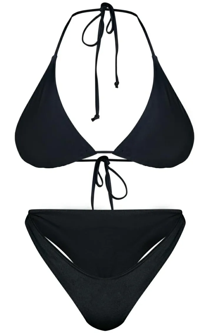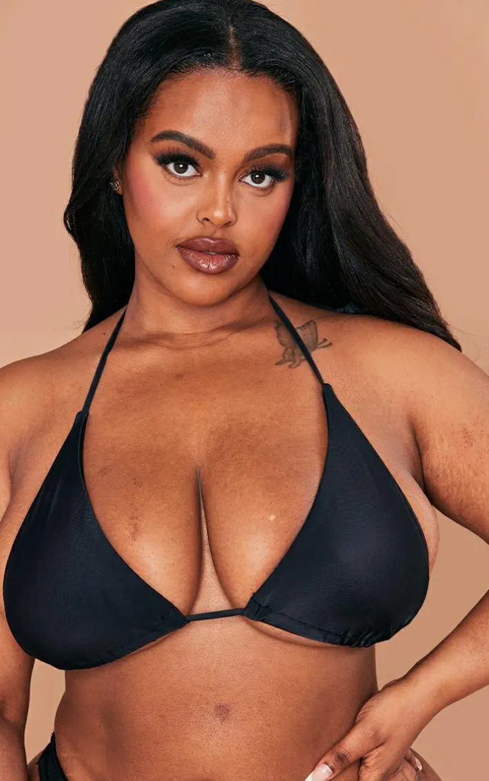 Get ready to steal all the stares in this bikini top. Featuring a black material with a triangle cup design, we’re in love. Style with the matching bottoms and statement accessories for a chic poolside vibe.