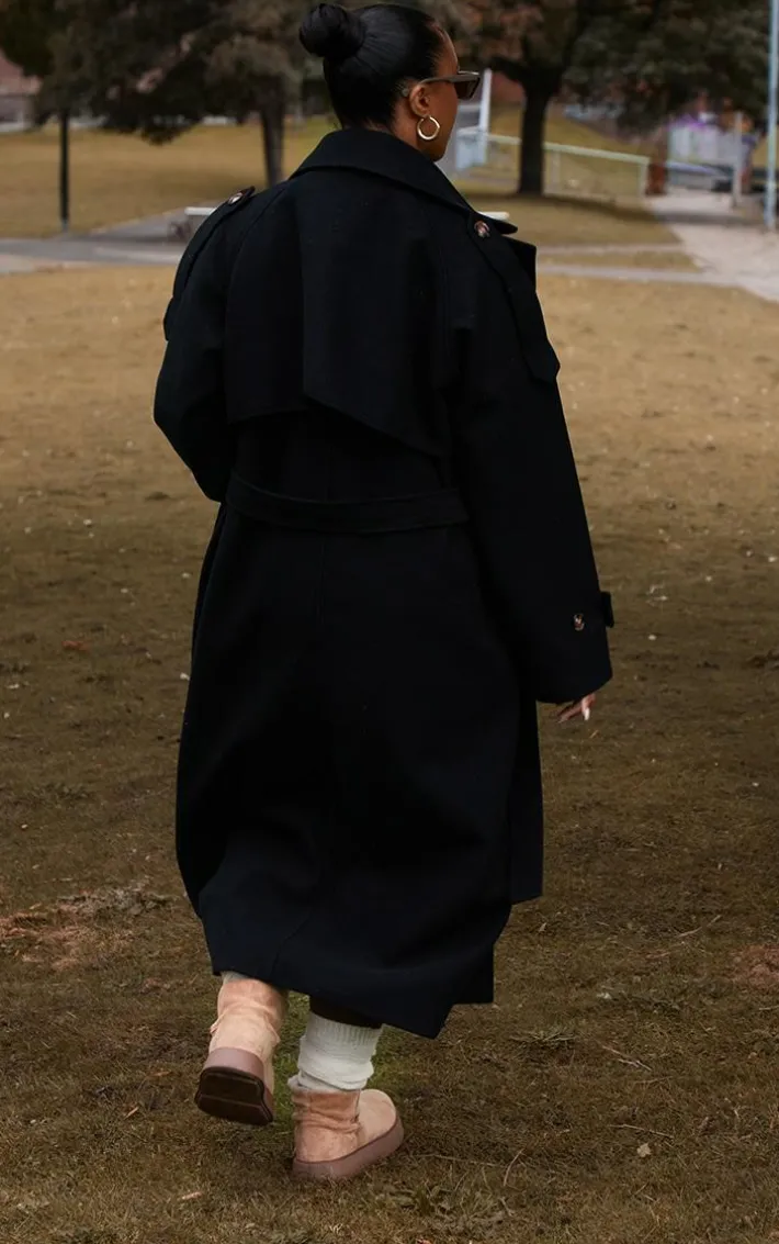 Nail all the A/W trends this season with this plus black oversized double breasted military trim coat. Brought to you in a black hue material with a double breasted military design and an oversized fit, how could you say no? This plus coat gives any look the ultimate finishing touch and definitely has our seal of approval. Simply add a neutral-toned ‘fit and comfy boots for an A/W ‘fit that everyone will want.