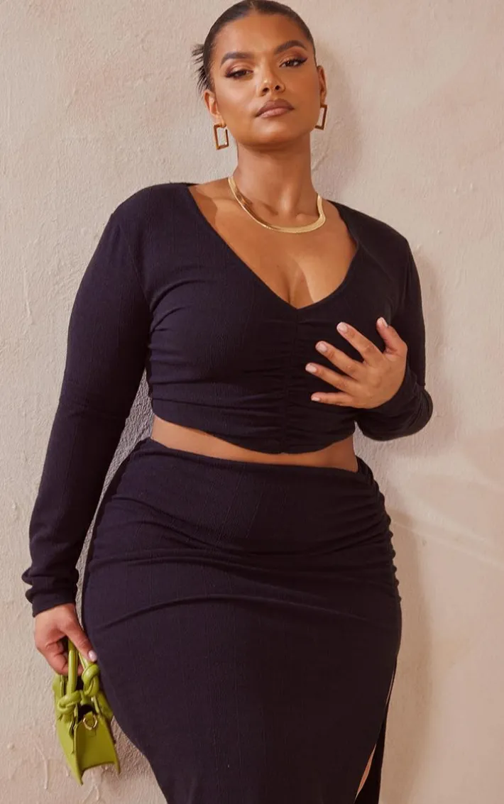 Keep it simple yet chic with this top. Featuring a black material with a ruched front design and long sleeves, what’s not to love? For a look we’re crushing on team with the matching skirt, a green bag and mules.