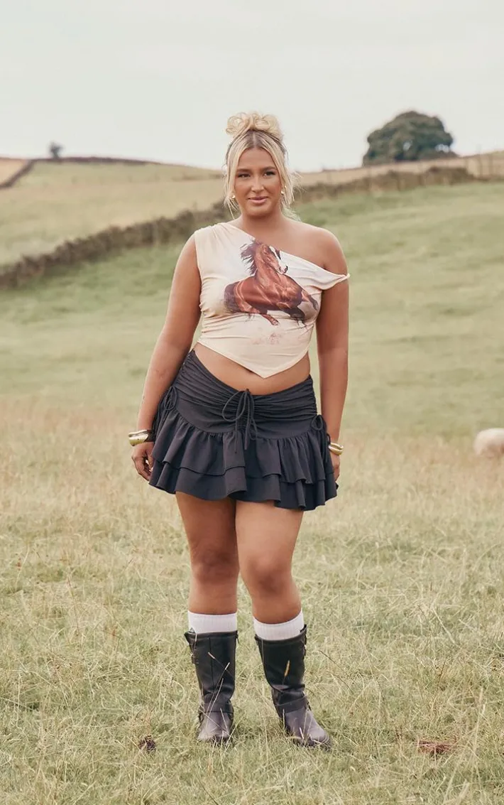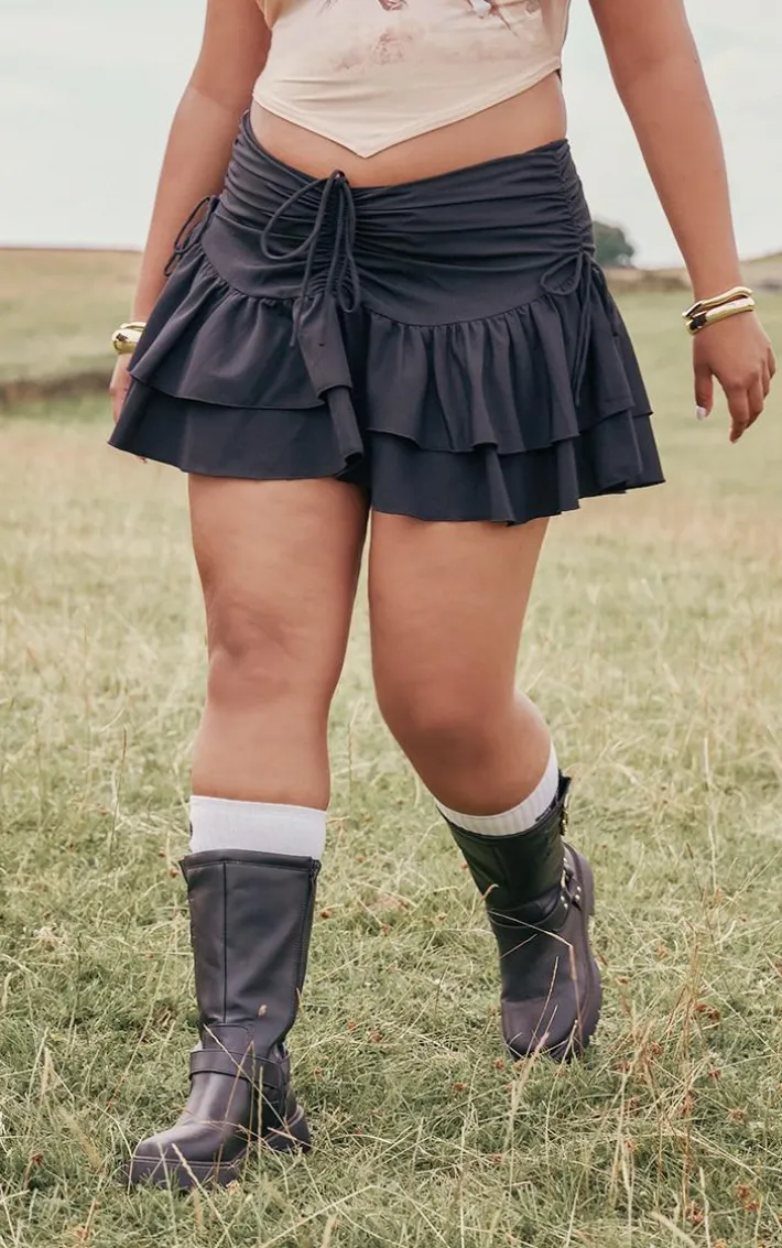 Look all kinds of chic in this plus black ruched ruffle detail mini skirt. Brought to you in a black hue material with a ruched design, ruffle detailing and a mini fit, how can you resist? Style this mini skirt with a crop top, chunky boots and gold accessories for a look that is sure to make heads turn.