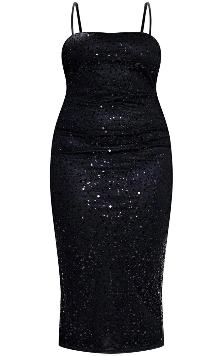 When the weekend calls for a little drama this plus black sequin mesh midi dress will have you at the center of attention. It is made using a black mesh material with sequin detail and a midi length, what more could you want ? Style this plus women’s midi de clear slip-on heels and statement accessories to elevate the look further.