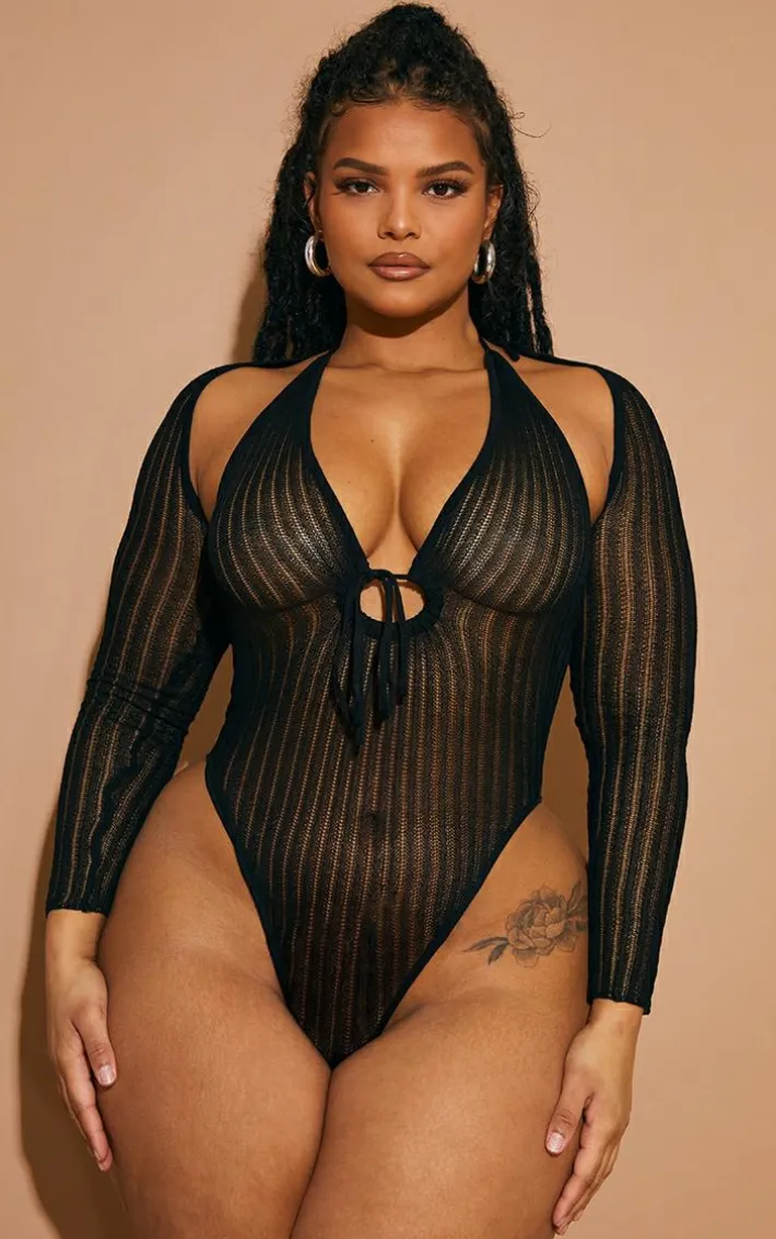 This bodysuit is sure to amp up any outfit. Featuring a black sheer knit material with long sleeves, what’s not to love? For some simple styling pair with your fave jeans and strappy heels.