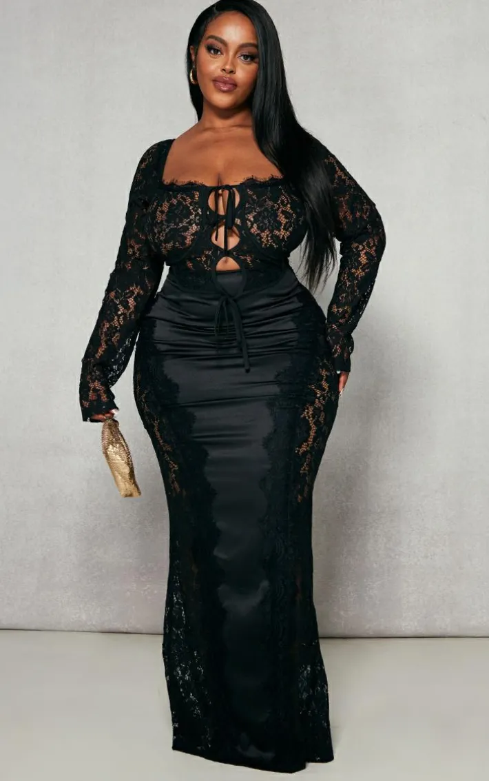 Look the best dressed for any occasion with this plus black tie front lace corset top. Whether you have a romantic date night planned or a brunchthis plus corset top with its black lace material and corset design, its the perfect piece for a glam vibe. Show off your daring side with its plunging neckline and lace-up front detail, what’s not to love? Style with the matching skirt, strappy heels and a gold metallic mini bag for a vibe that won’t go unnoticed.
