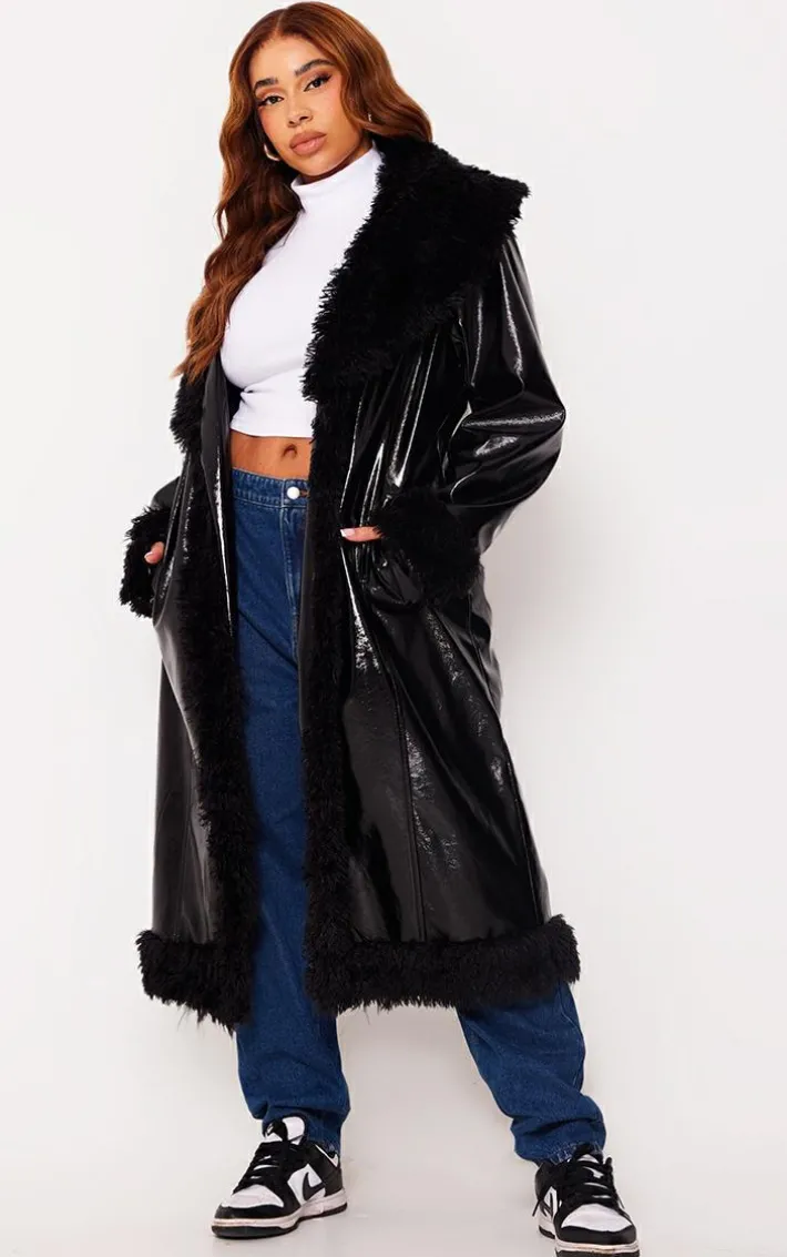 Take your outfit of the day to the next level with this plus black vinyl faux fur detail maxi coat. Made from a black vinyl material with faux fur trim detail and a maxi length, what’s not to love? This plus maxi coat is the ultimate finishing touch to your look and is sure to make everyone stop and stare. Team with an all-black ‘fit chunky kicks and everyday accessories for a look that will nail all the A/W trends.