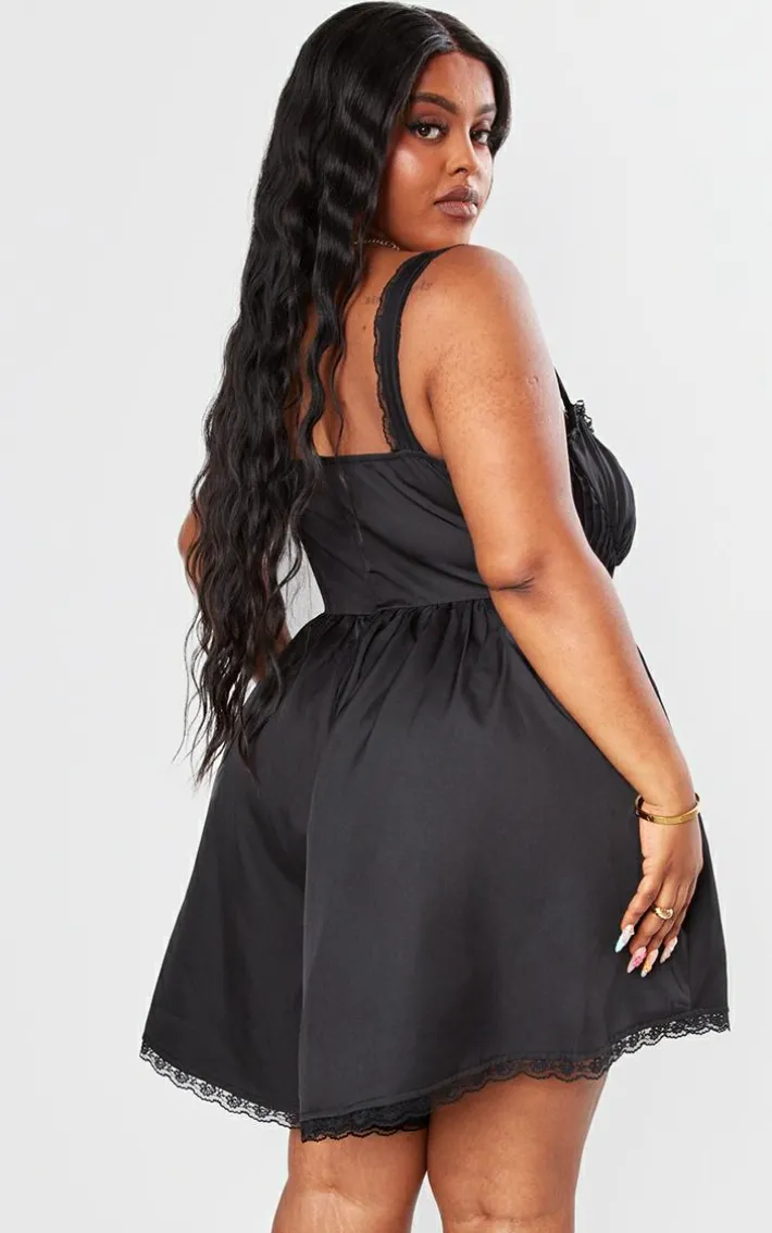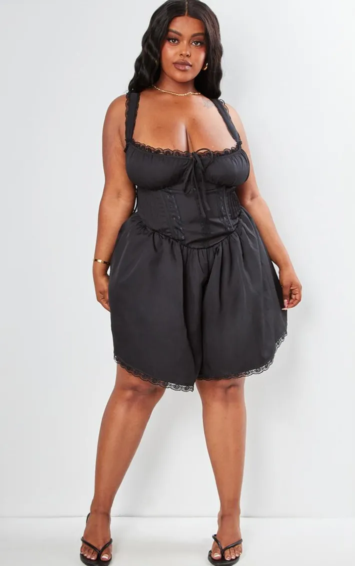 Get ready to have all eyes on you with this plus black woven lace detail strappy romper. Brought to you in a black woven material with lace detailing, a strappy design and a figure-flattering fit, whats not to love? Youll sure to earn all the likes with this dreamy piece. Finish off the look by pairing this with high heels and accessories. Its a yes from us.