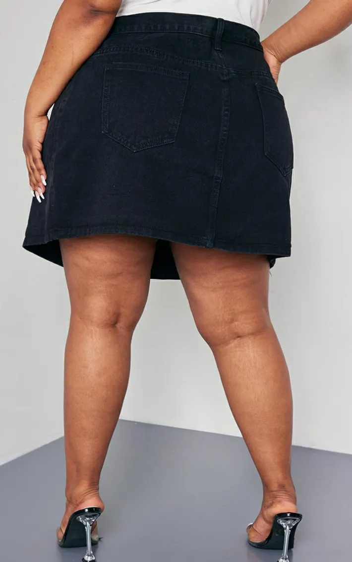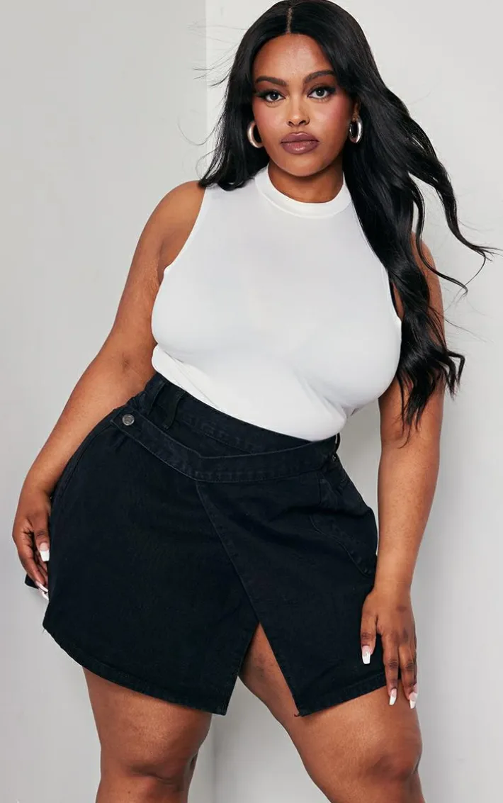 Work your styling techniques to make this plus black wrap denim mini skirt perfect for any AM to PM occasion. Made from a black hue denim material with a wrap design and a mini fit, how can you resist ? Style this plus mini skirt with a white racer neck top, clear strap heels and a mini bag for an effortlessly chic weekend-worthy look, or why not add fresh kicks for more of an off-duty vibe?