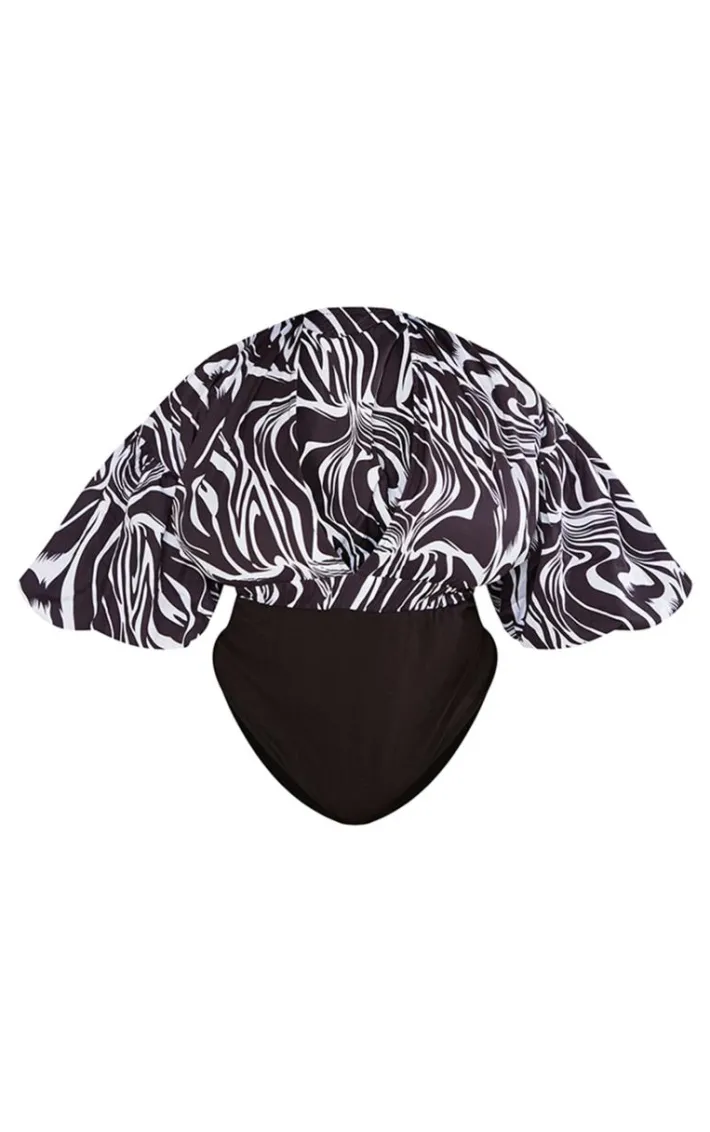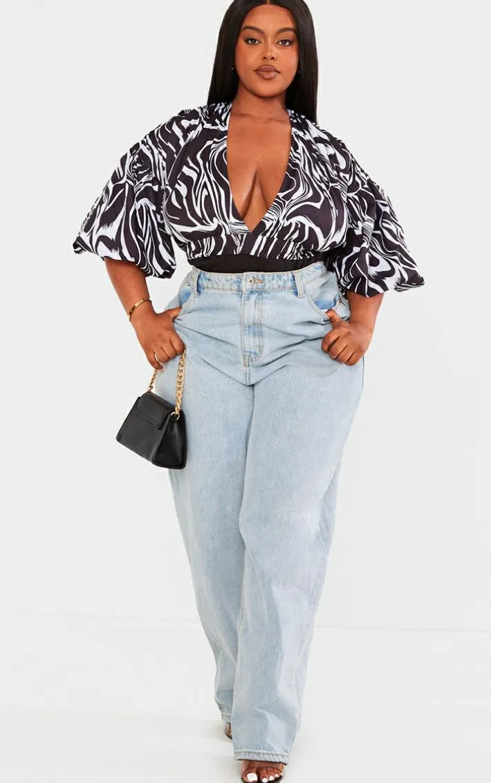 Bring some drama to your weekend plans with this plus black zebra print puffball sleeve bodysuit. Made from a black hue material with a fierce zebra print design, puff sleeves and a plunging neckline, how can you resist? Style this black bodysuit with jeans, heels and accessories for an effortlessly chic look that won’t go unnoticed .