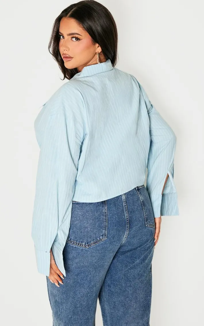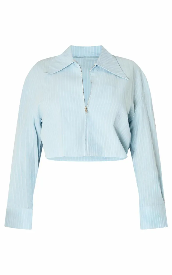 If you’re looking to add some pastel hues to your wardrobe, look no further than this plus blue striped zip up cropped shirt. This versatile shirt can be worn day or night with its blue striped fabric, zip up front and collared design. Keep things casual yet chic with a pair of wide leg jeans, white heels and your go-to accessories.