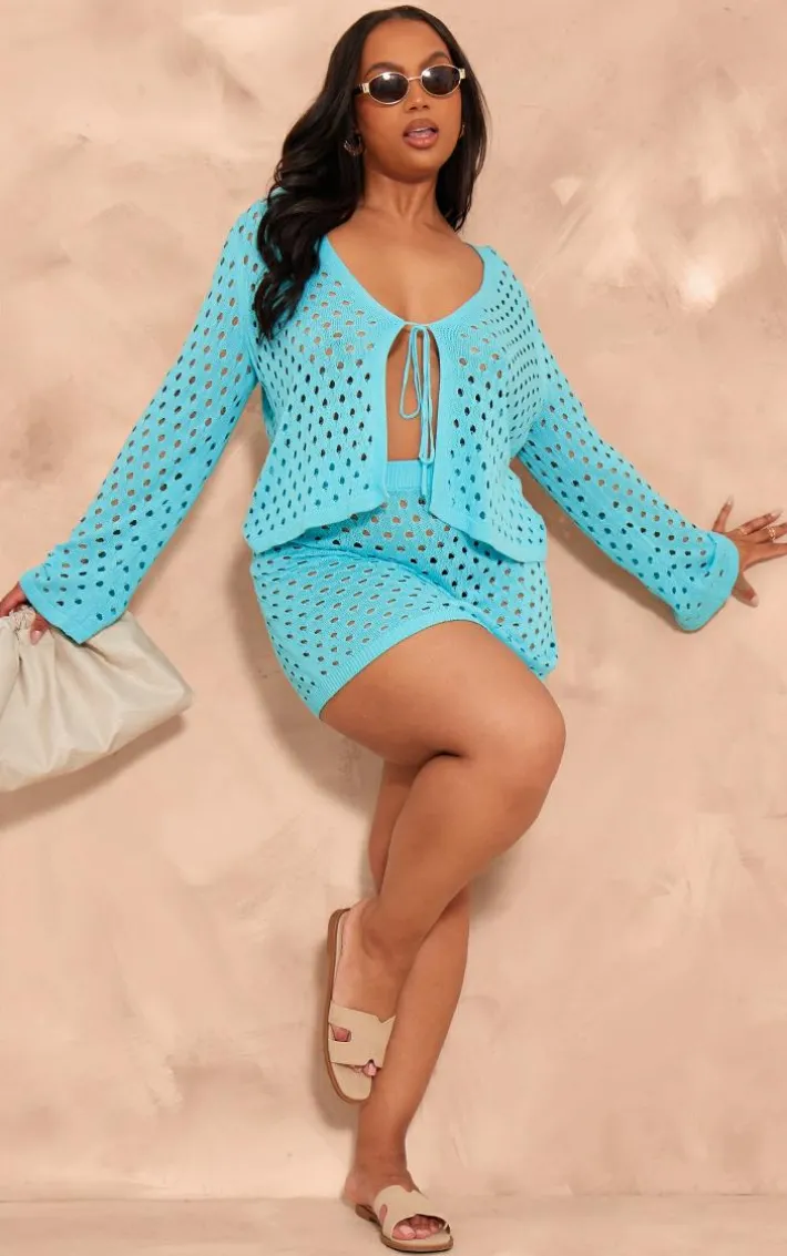 Switch up your new season style game with this plus blue tie front hole detail knit top. Brought to you in a blue knit material with a tie front design, long sleeves and hole detailing, how can you say no? Style this plus top with the matching skirt, sandals and sunglasses for a look that is sure to make you stand out from the rest.