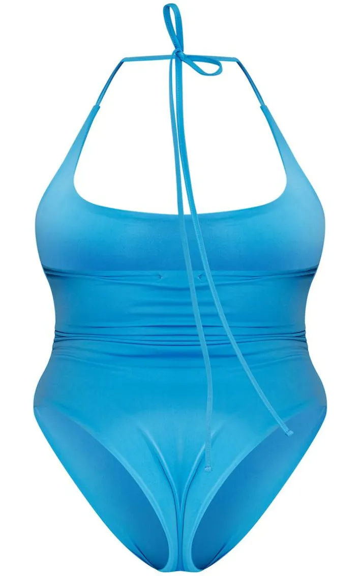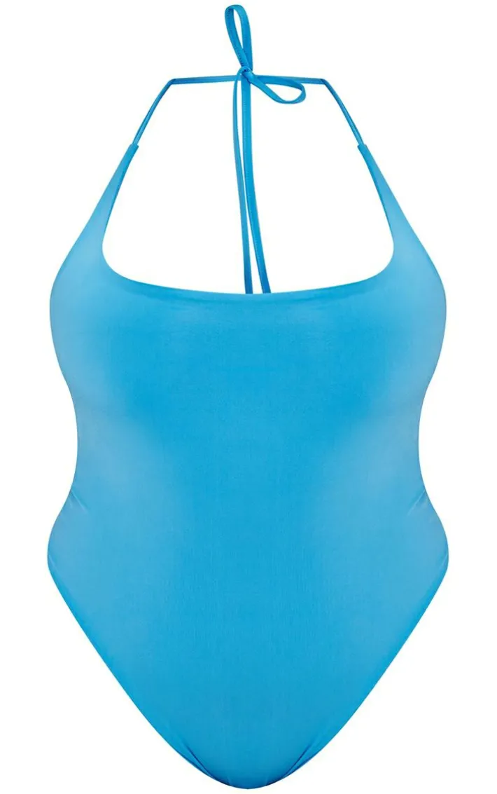 Get ready to show off your glow in this unreal swimsuit. Featuring a bright blue material with a cowl neck design. Pair with matching hue bottoms and a shoulder bag for the perfect poolside vibe.