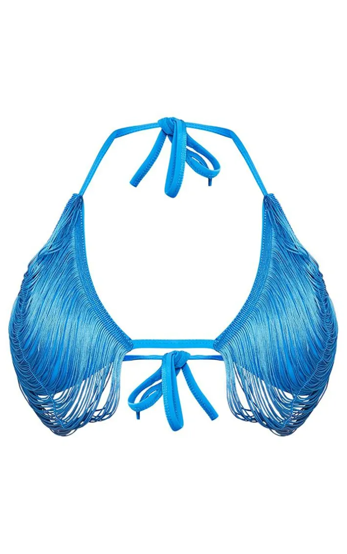 Take your vacay look to new heights with this bikini top. Featuring a bright blue material with a fringed design and a triangle design, we are obsessed. Style with bikini bottoms and statement accessories for a look that will get you noticed.