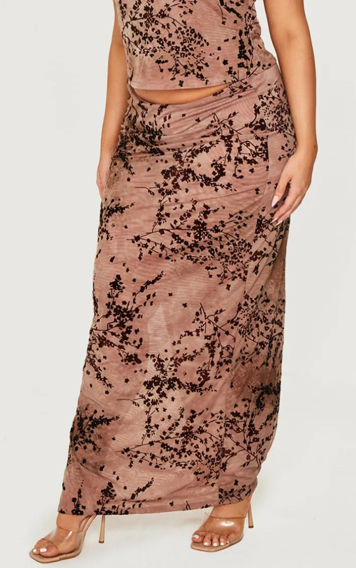 Take any look to new heights with this plus brown devore split leg maxi skirt. Brought to you in a brown devore material with a split leg detail and a maxi length, what more could you want? Pair this maxi skirt with the matching top and your go-to heels for an effortlessly chic look everyone will be talking about.