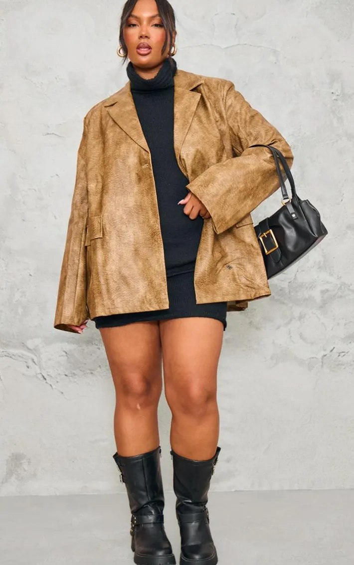 Instantly elevate your outfit of the day with this plus brown distressed PU oversized shoulder pad blazer. Brought to you in a brown hue distressed PU material with shoulder pads and an oversized fit, you really can’t go wrong. Style this plus blazer with your fave wardrobe pieces to add a chic finishing touch to any look.
