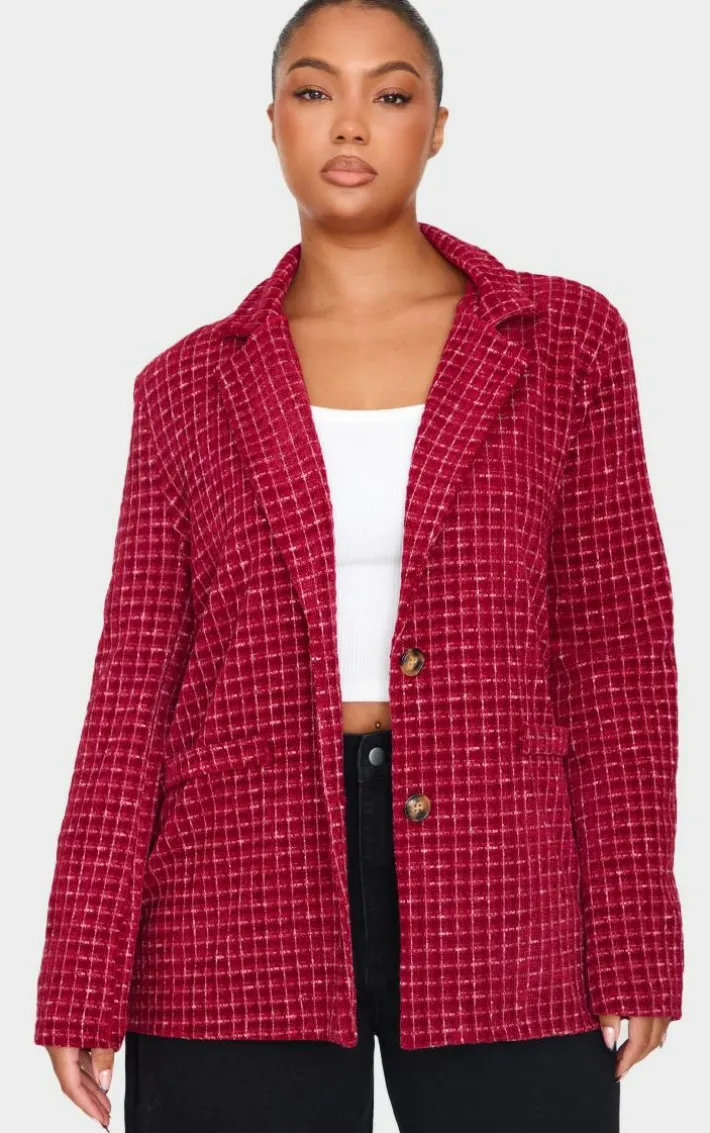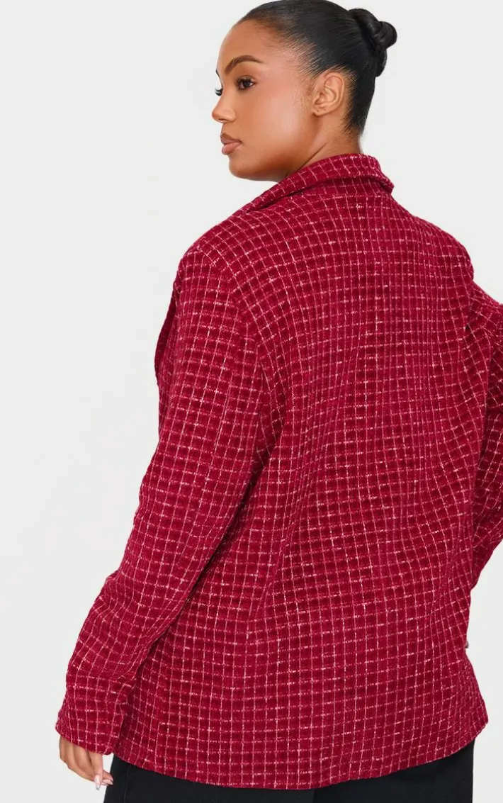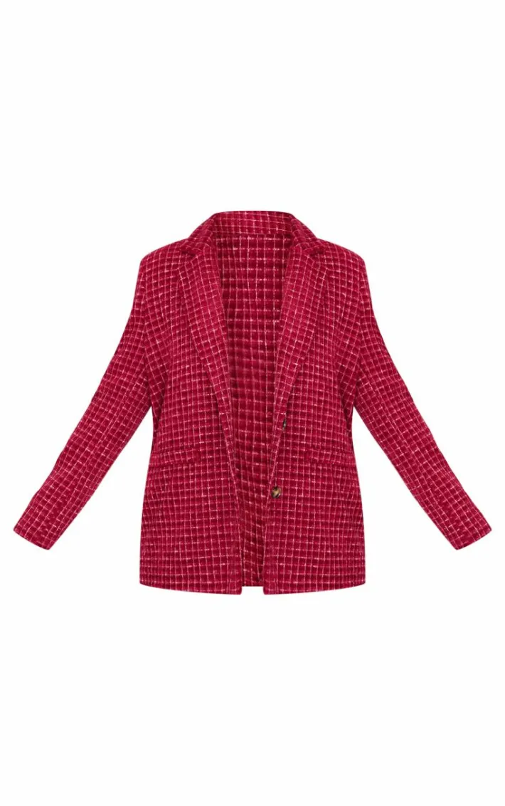 Stand out from the rest with this plus burgundy boucle check blazer. Brought to you in a burgundy boucle material with a check design, what more could you want? Team this blazer with some wide leg pants and your fave accessories to finish off the look everyone is talking about. It’s a definite yes from us.