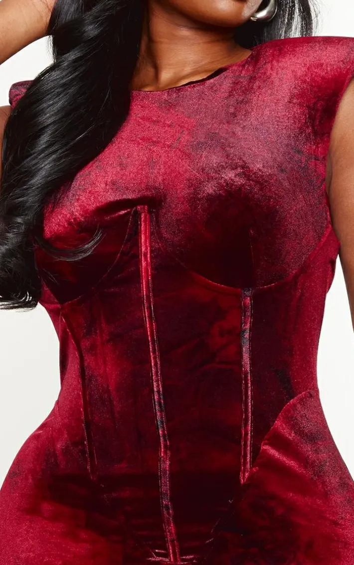 Look all kinds of glam in this plus dark red crushed velvet corset extreme shoulder bodycon dress. Brought to you in a dark red hue crushed velvet material with a corset design and extreme shoulder detail, this bodycon dress is at the top of our wish list. Style with gold heels and accessories for a glam finish we can’t take our eyes off.