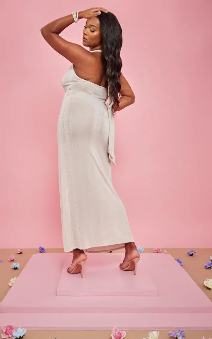 Enter the new season in style with this plus champagne acetate slinky plunge halterneck maxi dress. Brought to you in a champagne hue acetate slinky material with a plunging neckline, a halterneck design and a figure-flattering maxi fit with side split detail, we just can’t get enough. Style this plus dress with strappy heels and statement accessories for a look that will have all eyes on you.