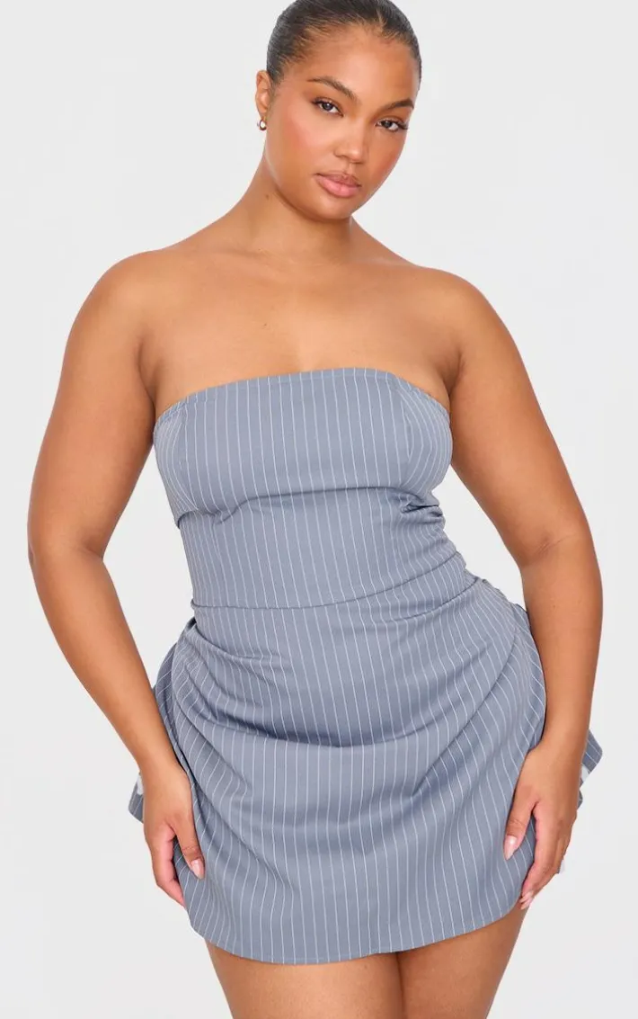 Look all kinds of chic in this plus charcoal pinstripe woven bandeau ruched side skort romper. Brought to you in a charcoal hue woven material with a pinstripe design, bandeau neckline and ruched side detail, this skort romper is all the new you need. Style with slip on heels and simple accessories for a look we’re loving.