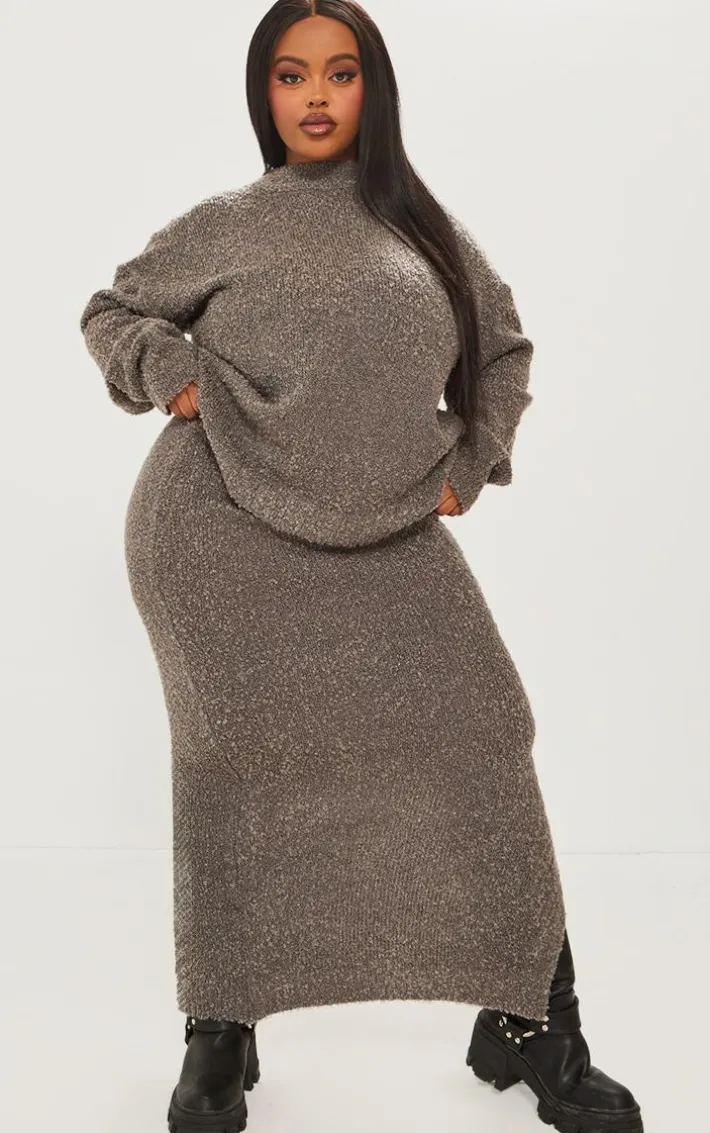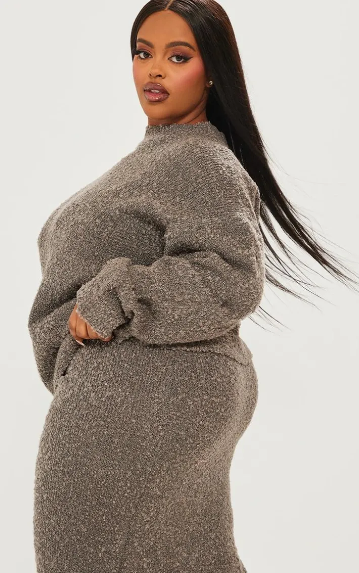 Hit refresh on your new season wardrobe with this plus charcoal soft knit boucle high neck sweater, it’s a definite yes from us whatever your plans. Made using a charcoal hue soft knit boucle material with a high neck design and a relaxed fit, this plus sweater just went straight to the top of your wish list. Team with the matching skirt, chunky boots and statement accessories for a look we just can’t get enough of.