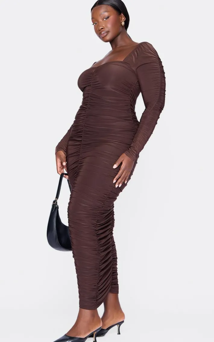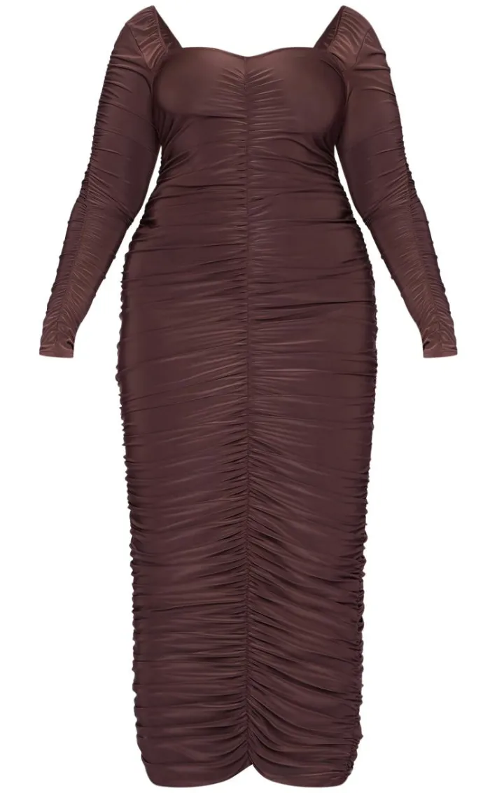 Look all kinds of chic in this plus chocolate black long sleeve extreme ruched midaxi dress. Brought to you in a chocolate material with a long sleeve design and an extreme ruched detailing, you are sure to turn heads in this midaxi dress. Pair with some court heels and your trusty gold hoops to elevate the look even further.