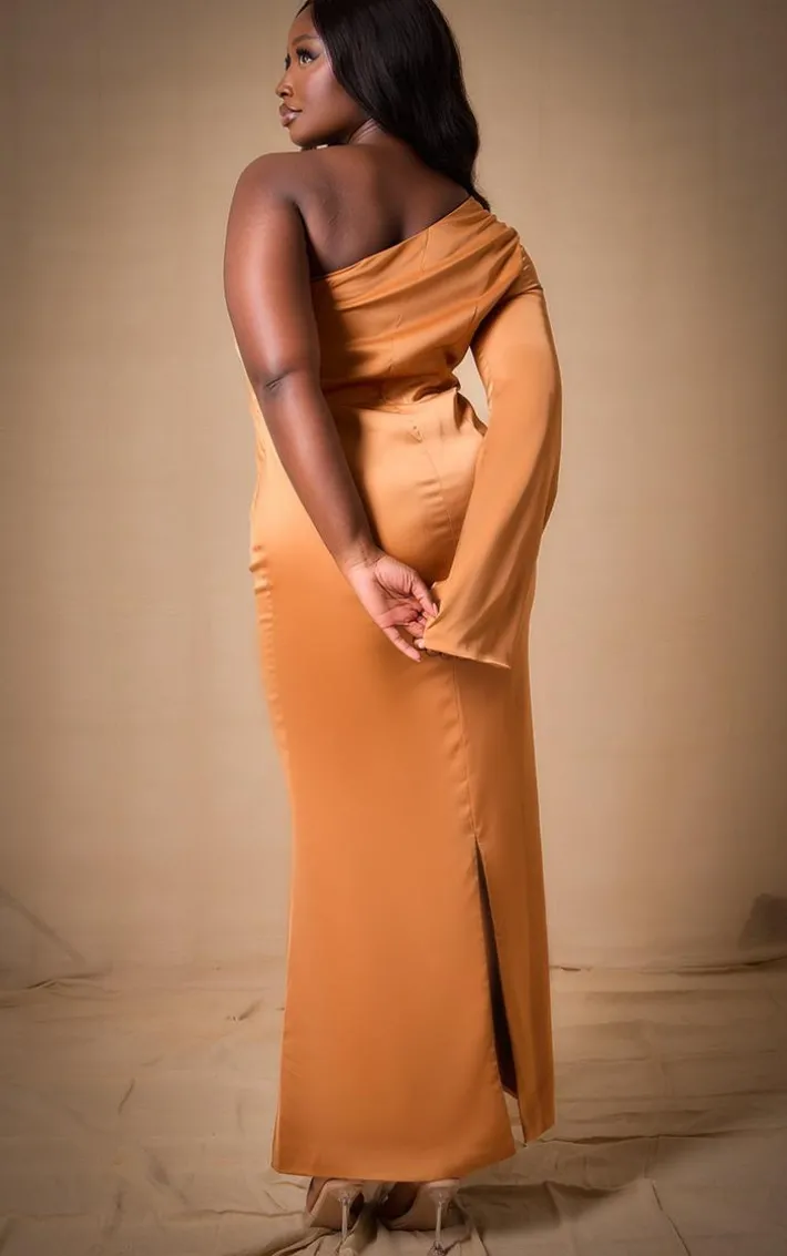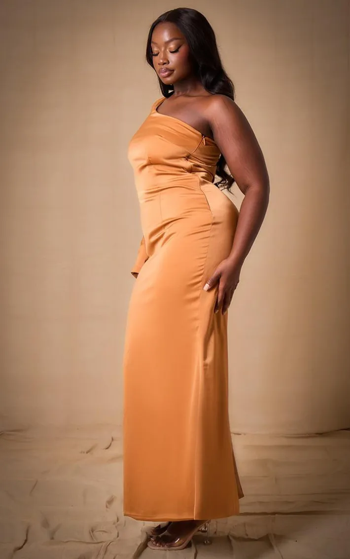 Get occasion ready with this unreal plus copper bridesmaid satin one shoulder flared sleeve maxi dress. Brought to you in a copper hue satin material with a one shoulder flared sleeve design and a figure-worshipping maxi fit, how can you not fall in love? Simply add some glam heels and accessories for a look that is guaranteed to make heads turn.