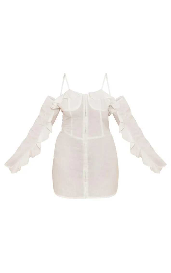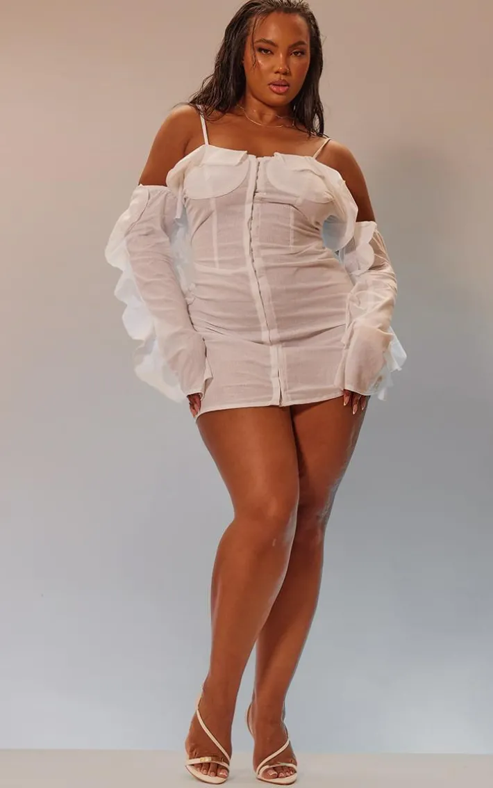 Take your new season look to a whole new level with this plus cream linen look frill bardot bodycon dress. Brought to you in an cream linen look material with frill detailing and a figure-hugging, how can you resist? Style this with heels and accessories for a look that is sure to make heads turn for all the right reasons.