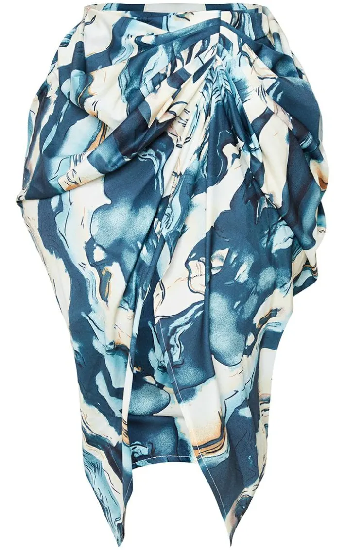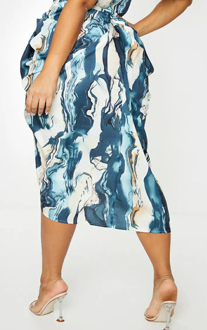 Take your look to new heights with this midi skirt. Featuring a cream marble print material with ruched detailing, a thigh-high split and a midi length. Style this with the matching bodysuit and barely-there heels to complete the look.