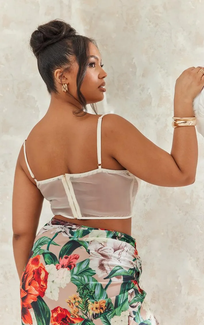 Feed your new season style need with this plus cream satin sheer panel corset. This corset is brought to you in a cream satin material for a luxe vibe we are obsessing over. With a sheer design for a feminine look and panel detailing, we just can’t get enough. Style with your fave statement skirt and some tie up the leg heels to finish off the look we are loving.