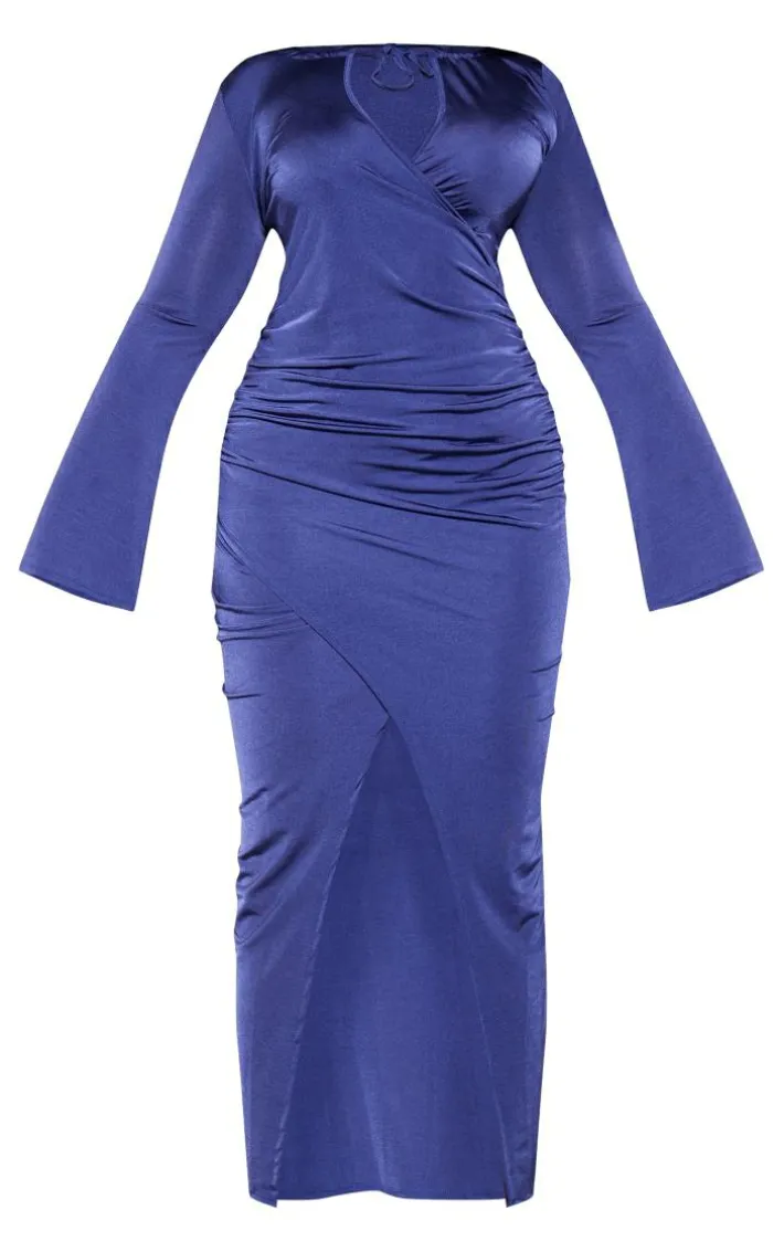 Be sure to make heads turn in this plus dark blue slinky flare sleeve tie front wrap maxi dress. Brought to you in a dark blue hue slinky material with long flared sleeves, tie front detailing and a maxi fit, how can you not fall in love? Style this maxi dress with clear strap heels and some glam accessories for an occasion look we just can’t get enough of.