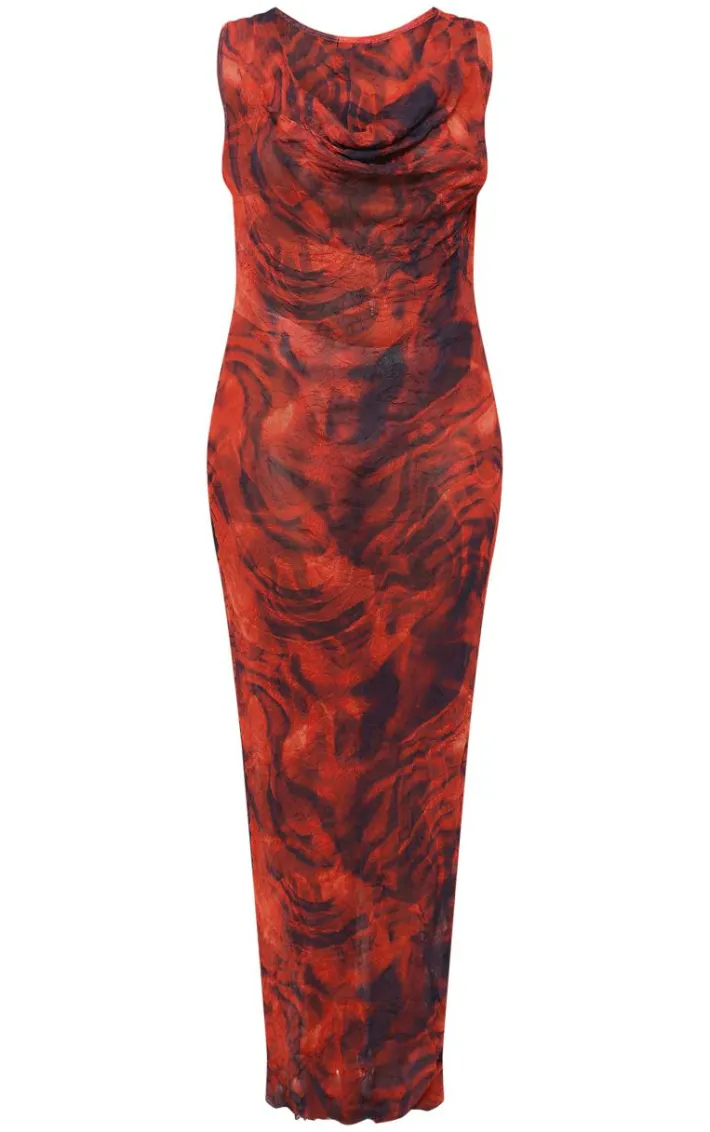 Dare to steal all the stares in this plus dark red abstract print crinkle mesh cowl neck maxi dress. Brought to you in a dark red crinkle mesh material with an abstract print design, a cowl neckline and a flattering maxi fit, how can you not fall in love? Style this dark red dress with heels and gold accessories for an occasion look that won’t be forgotten.