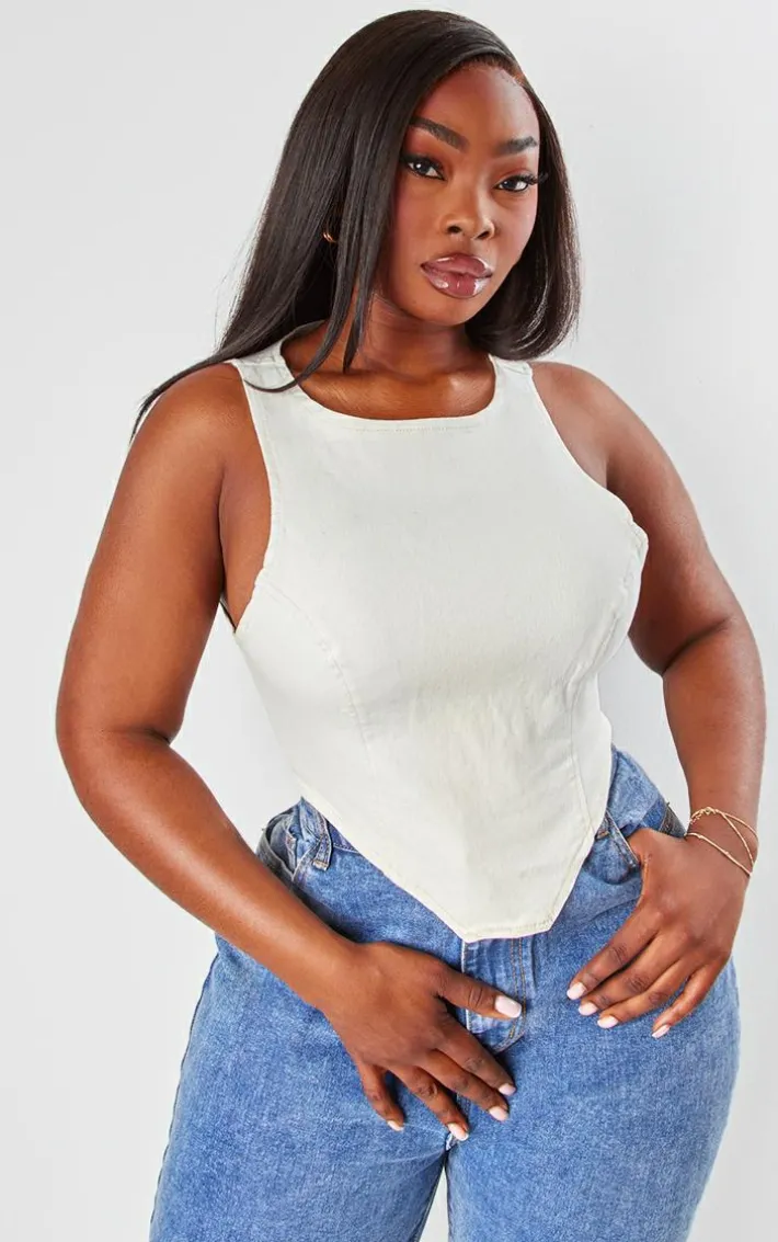 Get ready for the ultimate glow up with this plus ecru dipped front denim crop top. Brought to you in an ecru denim material with a dipped front giving you a flattering fit like no other, what more could you want? With a cropped length, we are obsessed. Team with your trusty pair of jeans and go-to heels for a fool proof finish.