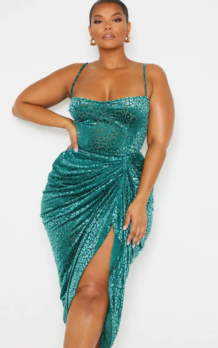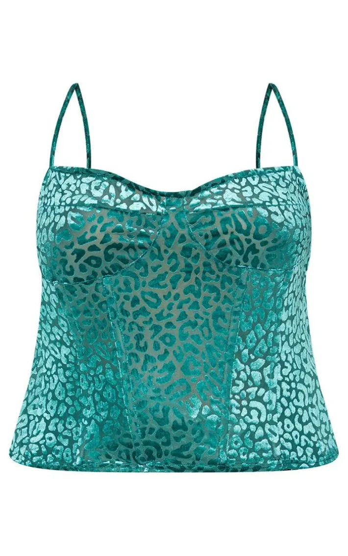 This top is sure to have all eyes on you. Featuring an emerald green velvet material with a leopard print design and a structured corset fit. Team this with the matching skirt and barely-there heels to complete the look.