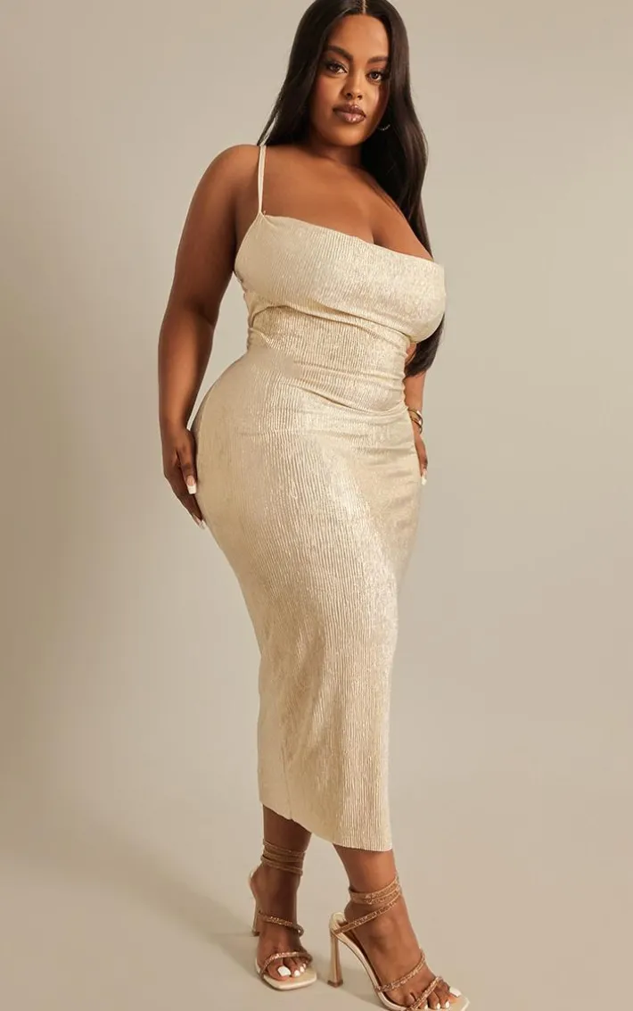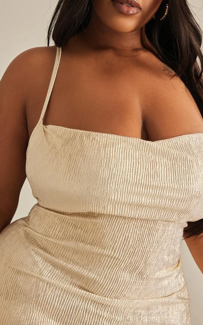 Get ready to look all kinds of glam in this plus gold textured glitter cowl neck midi dress. Brought to you in a gold hue textured material with a chic cowl neckline, glitter detailing for that extra touch of luxe and a flattering midi fit, how can you not fall in love? Style this midi dress with tie up heels, a faux fur jacket and a gold clutch bag for a look they won’t be able to take their eyes off.