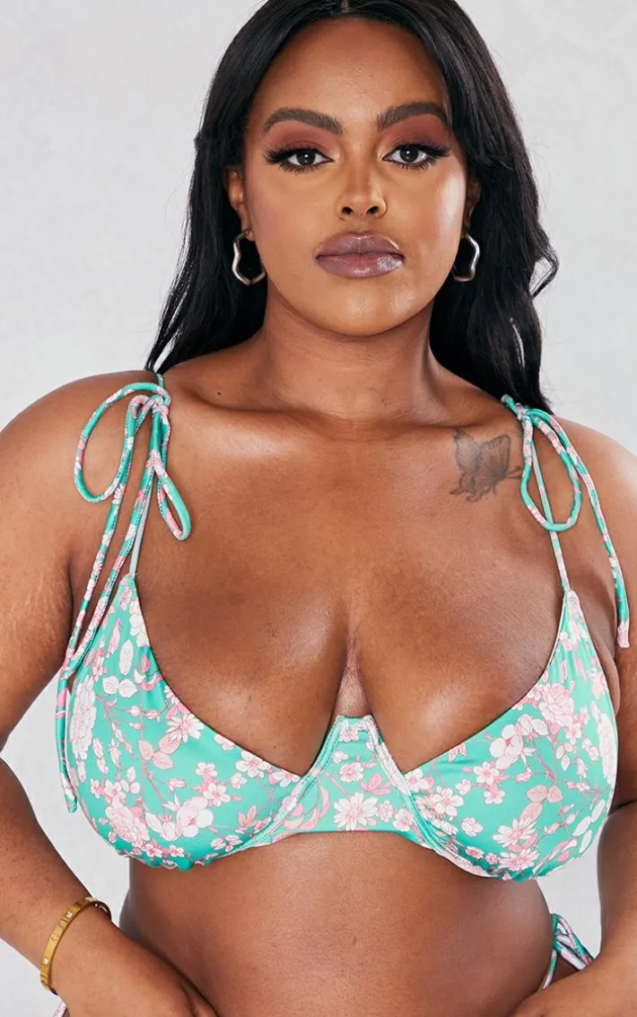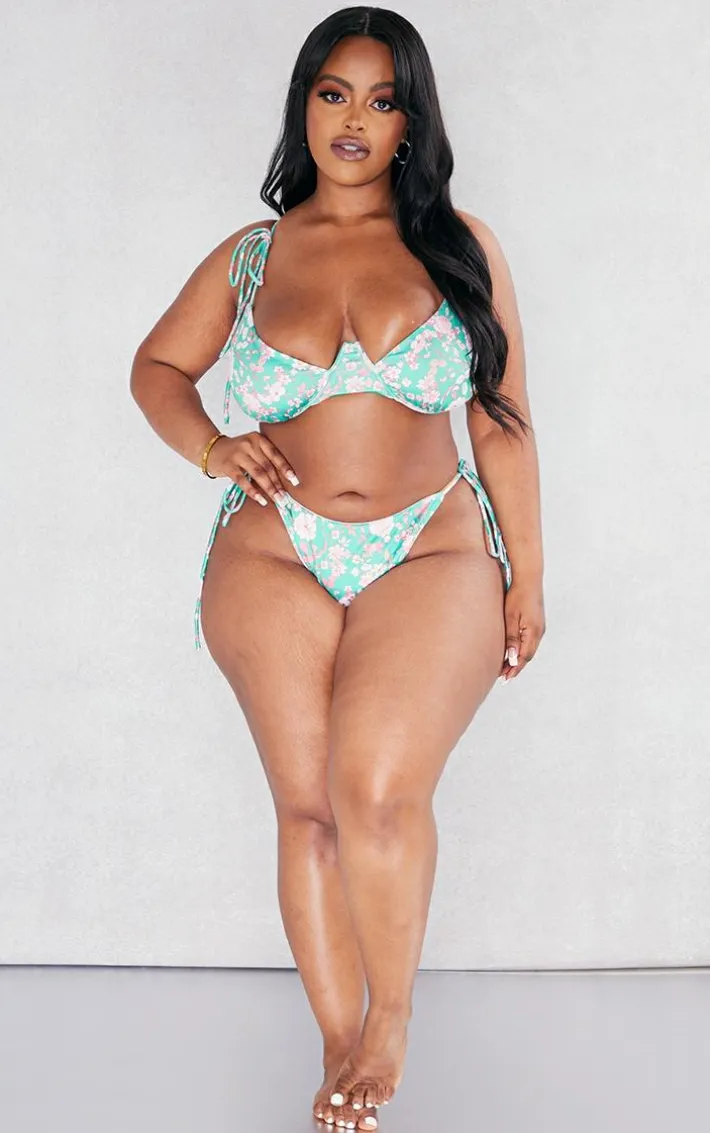 Be sure to impress on your next vacay with this plus green floral underwired bikini top. Its green floral print material is perfect for freshening up your collection whilst its underwired detail gives you the ultimate finishing touch. This plus bikini top is just what you need to ensure you earn best dressed even whilst relaxing by the pool. Pair with the matching bottoms, the beach skirt and slides for a flawless finish.