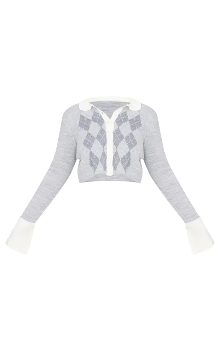 Add this plus grey argyle jacquard knitted button up top to your day to day wardrobe. Brought to you in a versatile grey shade, with a must have argyle jacquard design, cosy knitted material and button up finish, how can you say no? This top teams perfectly with the matching skirt and simple accessories for a fool proof finish.