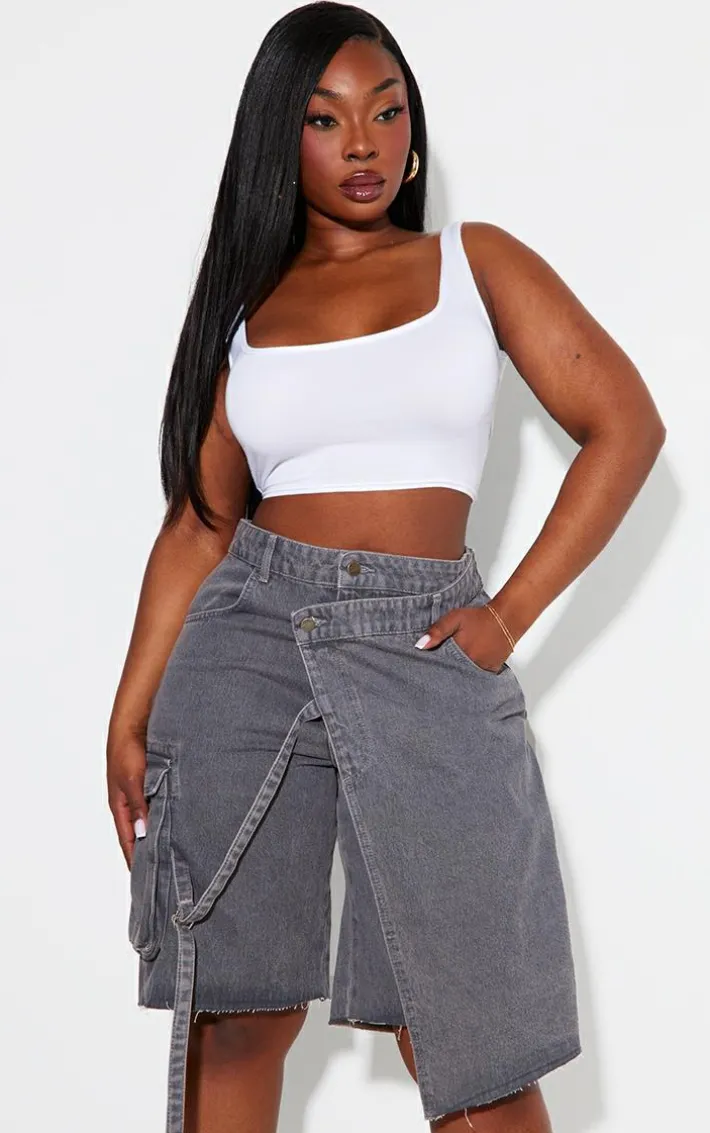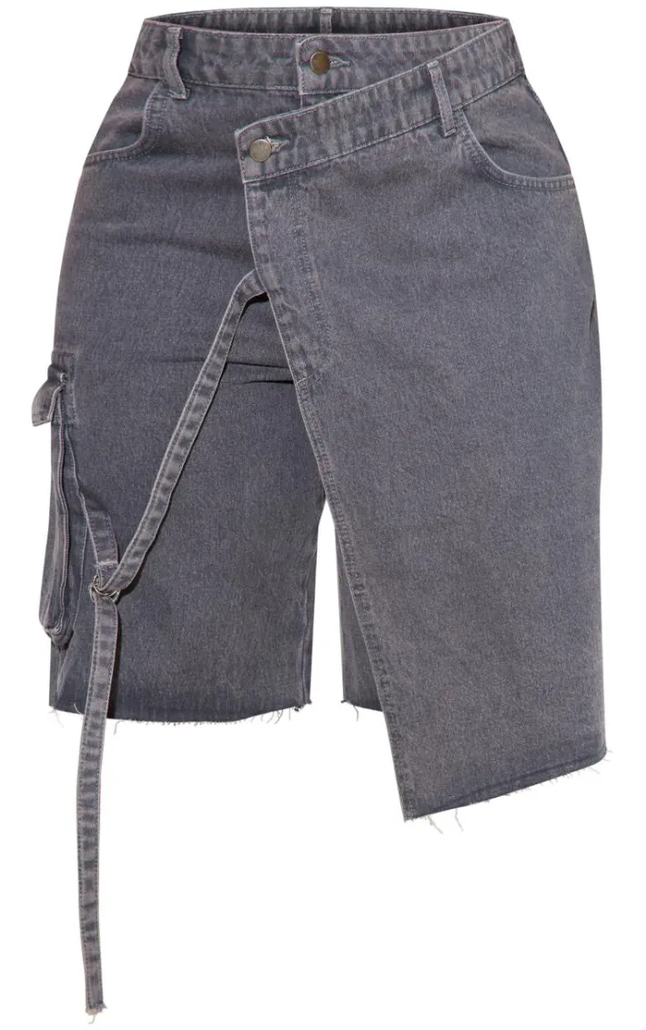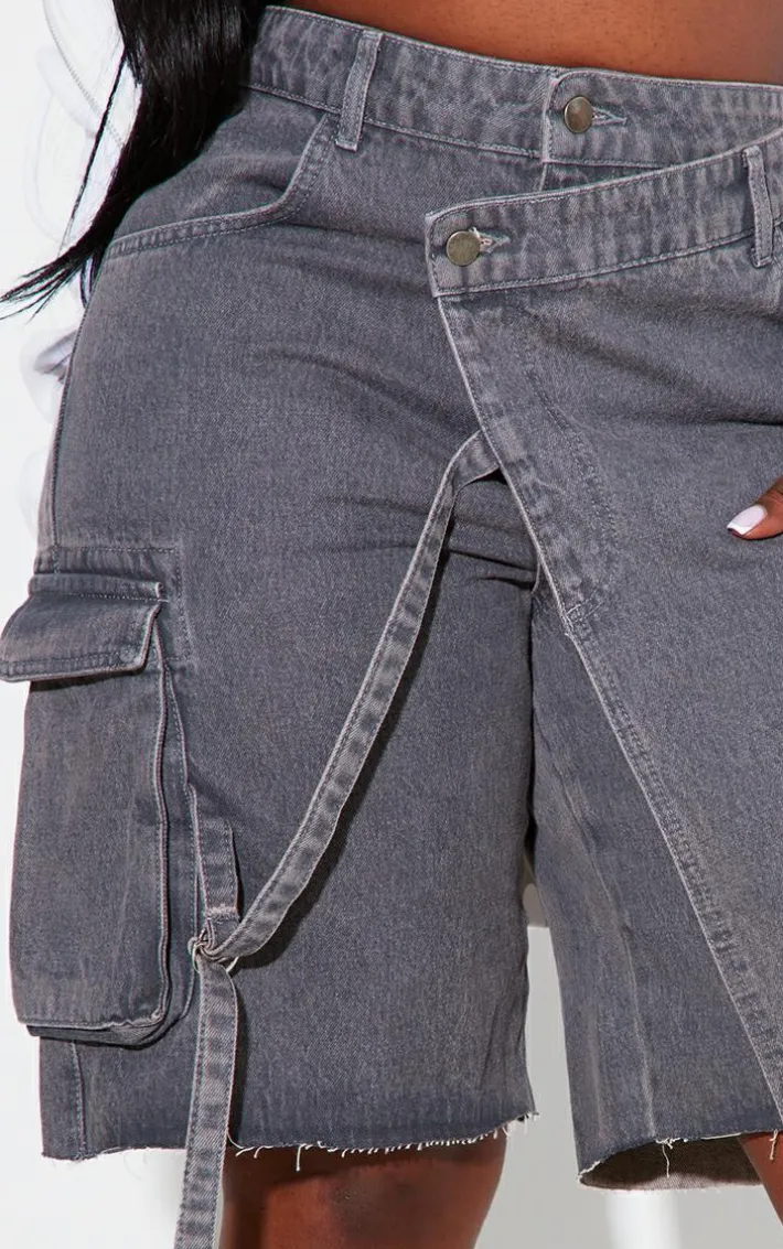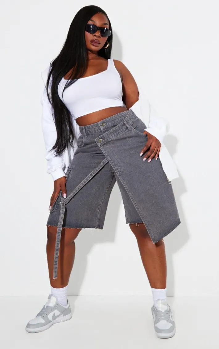 Take your everyday look to the next level with these plus washed black asymmetric buckle wrap over detail jorts, perfect for your everyday styling and beyond. Brought to you in a washed black material with an asymmetric design and a buckle wrap over detail, we simply can’t get enough. With their versatile style these jorts are sure to be your new go-to. Style with a basic tee and your fave sneakers for a look that we can’t get enough of.