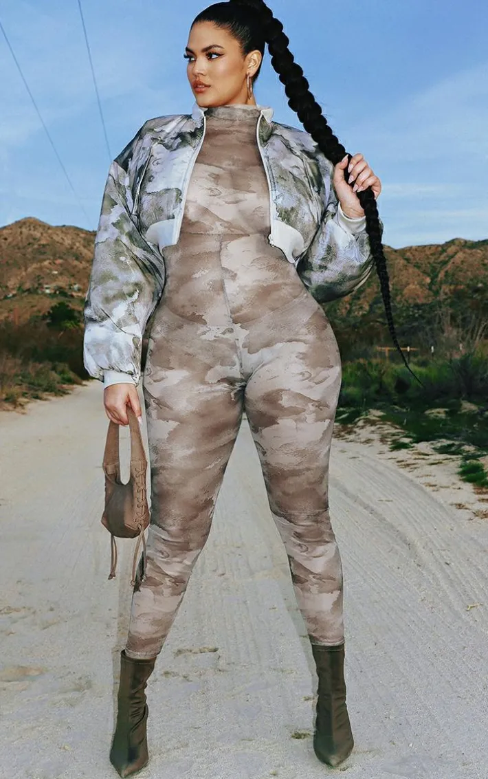 This plus grey camo printed mesh jumpsuit is sure to add some drama to your new season wardrobe. With a grey hue and a camo printed design, you will be center of attention in any room. This dreamy jumpsuit will show off your shape in all the right places. In a mesh material, what’s not to love? Pair with some clear heels and a cute clutch to take your look to new heights.