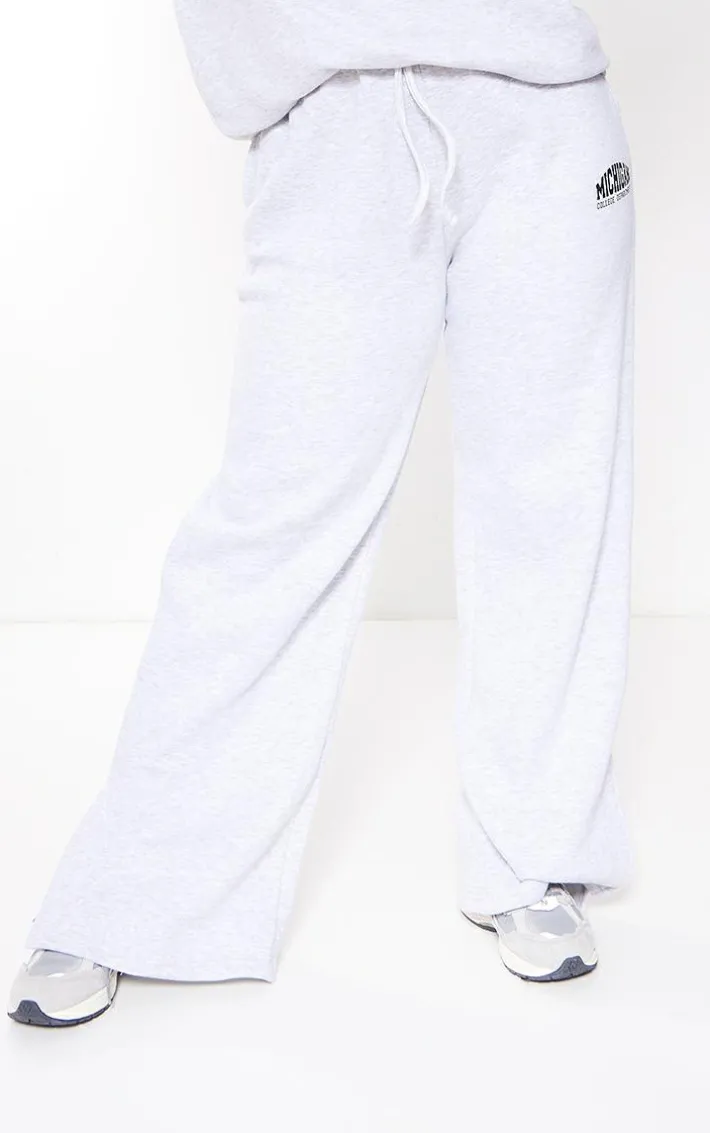 Take your off-duty wardrobe to the next level with these plus grey marl Michigan printed wide leg sweatpants. Made from a grey marl material with a ‘Michigan’ printed design, how could you say no? These plus sweatpants are perfect for an everyday vibe and beyond. Just add the matching top, sneakers and gold accessories for a flawless finish.