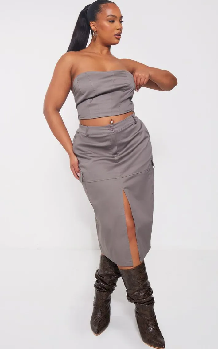 You are sure to be obsessed with this plus grey split front cargo skirt for your new season wardrobe doll. Brought to you in a grey hue material with a cargo design and a split hem, how could you not be in love? With unlimited styling potential for both the weekend and everyday looks, this plus skirt really does tick all the boxes. Team with a crop top, chunky sneakers and silver accessories for a fresh finish.