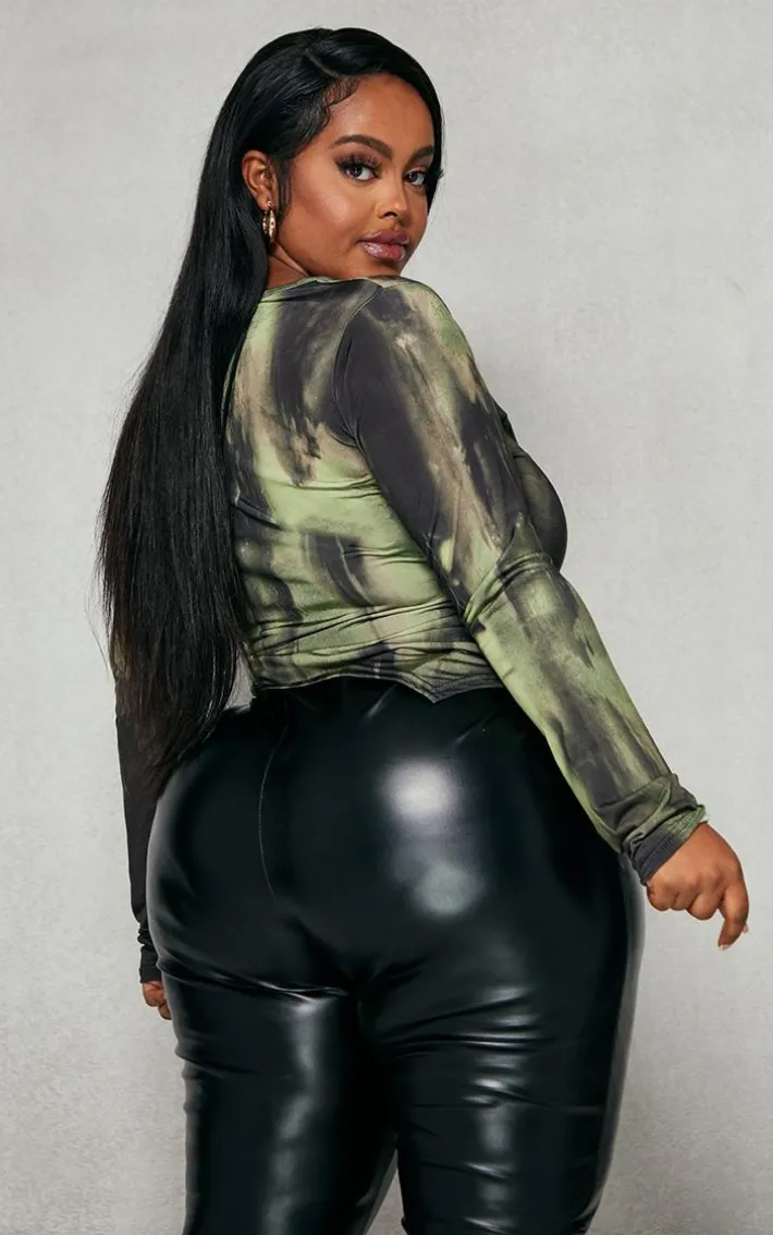 Introducing your new season wardrobe go to with this statement plus khaki abstract asymmetric hem slinky top. It is the perfect piece to level up your off-duty or weekend look. This plus top features a khaki abstract print slinky material with an asymmetric hem design and long sleeves. For a look that is sure to bring all the drama team this slinky women’s top with faux leather bottoms, clear heels and hoop earrings.
